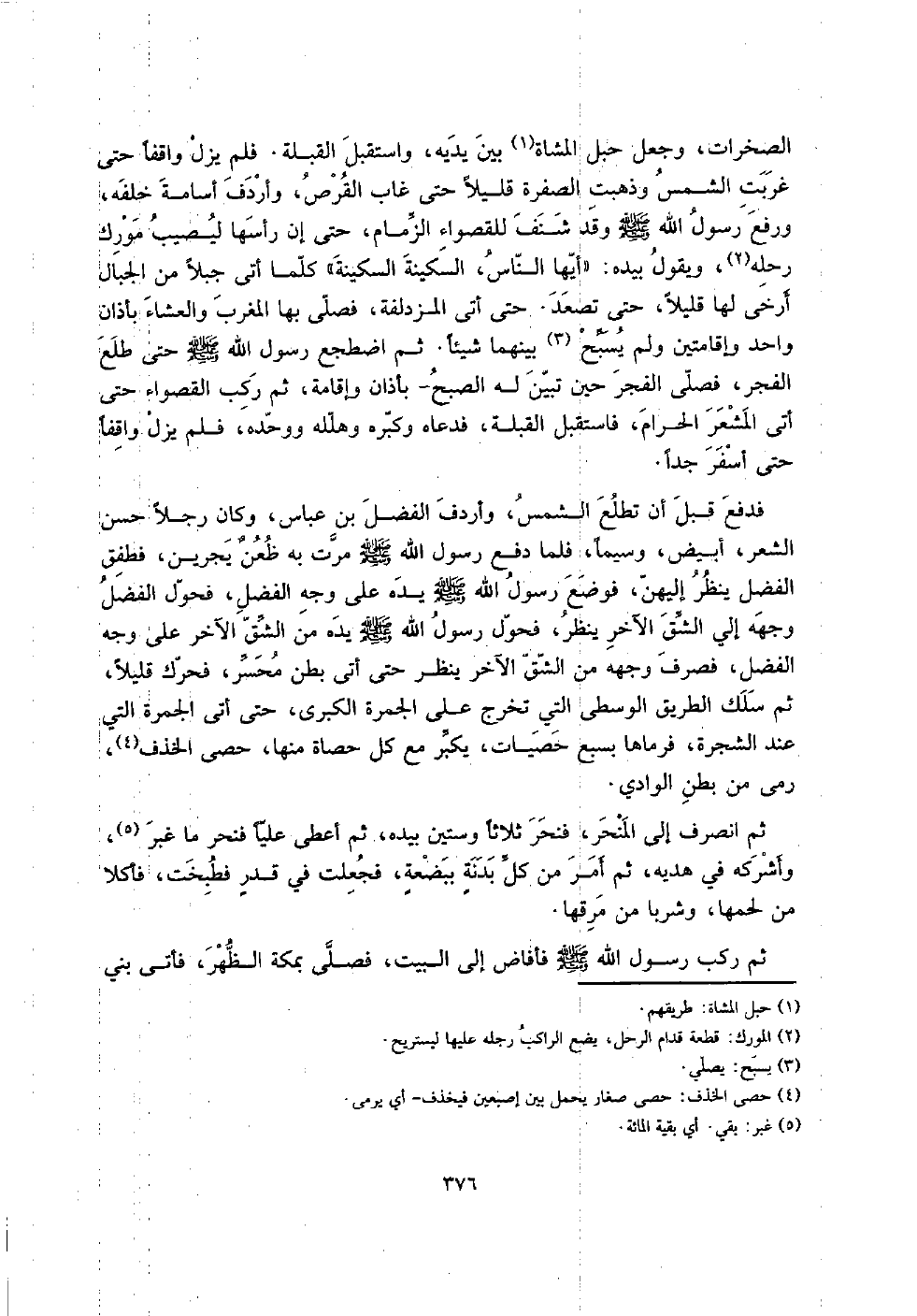 فَدفع قبل أَن تطلع الشَّمْس، وَأَرْدَفَ الْفضل بن عَبَّاس، وَكَانَ رجلا حسن الشّعْر، أَبيض، وسيماً، فَلَمَّا دفع رَسُول الله صلى الله عَلَيْهِ وَسلم مرت بِهِ ظعنٌ يجرين، فَطَفِقَ الْفضل ينظر إلَيْهِنَّ، فَوضع رَسُول الله صلى الله عَلَيْهِ وَسلم يَده على وَجه الْفضل، فحول الْفضل وَجهه إِلَى الشق الآخر ينظر، فحول رَسُول الله صلى الله عَلَيْهِ وَسلم يَده من الشق الآخر على وَجه الْفضل، فصرف وَجهه من الشق الآخر ينظر حَتَّى أَتَى بطن محسر فحرك قَلِيلا، ثمَّ سلك الطَّرِيق الْوُسْطَى الَّتِي تخرج على الْجَمْرَة الْكُبْرَى، حَتَّى أَتَى الْجَمْرَة الَّتِي عِنْد الشَّجَرَة، فَرَمَاهَا بِسبع حَصَيَات، يكبر مَعَ كل حَصَاة مِنْهَا، حَصى الْخذف، رمى من بطن الْوَادي.