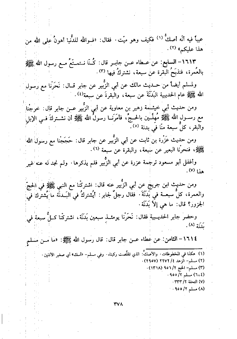 1613 - السَّابِع: عَن عَطاء عَن جَابر قَالَ: كُنَّا نتمتع مَعَ رَسُول الله صلى الله عَلَيْهِ وَسلم بِالْعُمْرَةِ، فنذبح الْبَقَرَة عَن سَبْعَة، نشترك فِيهَا.