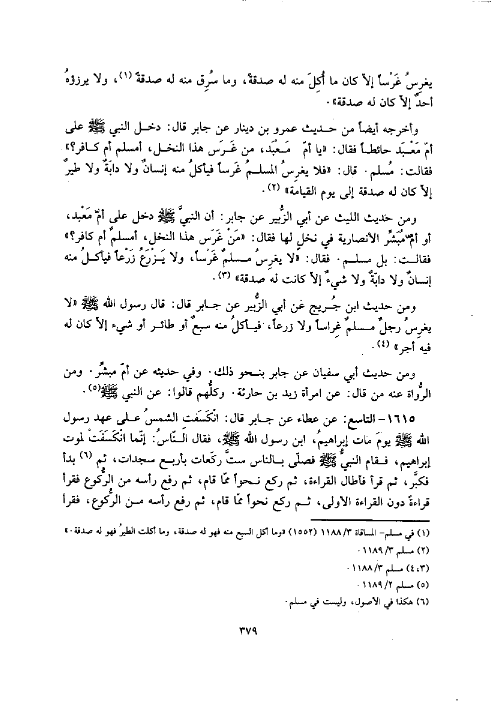 1615 - التَّاسِع: عَن عَطاء عَن جَابر قَالَ: انكسفت الشَّمْس على عهد رَسُول الله صلى الله عَلَيْهِ وَسلم يَوْم مَاتَ إِبْرَاهِيم، ابْن رَسُول الله صلى الله عَلَيْهِ وَسلم، فَقَالَ النَّاس: إِنَّمَا انكسفت لمَوْت إِبْرَاهِيم، فَقَامَ النَّبِي صلى الله عَلَيْهِ وَسلم فصلى بِالنَّاسِ سِتّ رَكْعَات بِأَرْبَع سَجدَات، ثمَّ بَدَأَ فَكبر، ثمَّ قَرَأَ فَأطَال الْقِرَاءَة، ثمَّ ركع نَحوا مِمَّا قَامَ، ثمَّ رفع رَأسه من الرُّكُوع فَقَرَأَ قِرَاءَة دون الْقِرَاءَة الأولى، ثمَّ ركع نَحوا مِمَّا قَامَ، ثمَّ رفع رَأسه من الرُّكُوع، فَقَرَأَ
