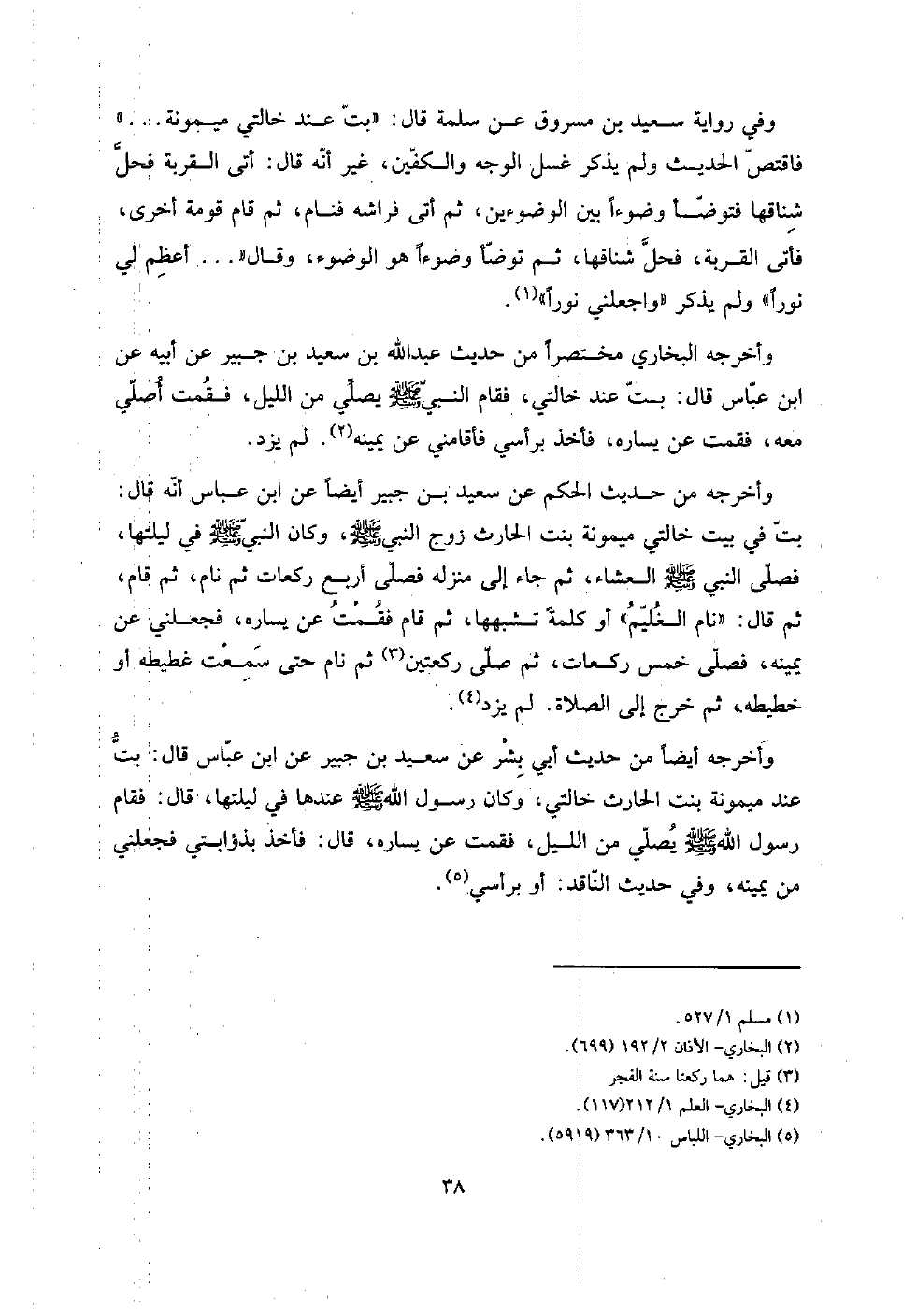 بت عِنْد خَالَتِي، فَقَامَ النَّبِي صلى الله عَلَيْهِ وَسلم يُصَلِّي من اللَّيْل، فَقُمْت أُصَلِّي مَعَه، فَقُمْت عَن يسَاره، فَأخذ برأسي فأقامني عَن يَمِينه. لم يزدْ.
