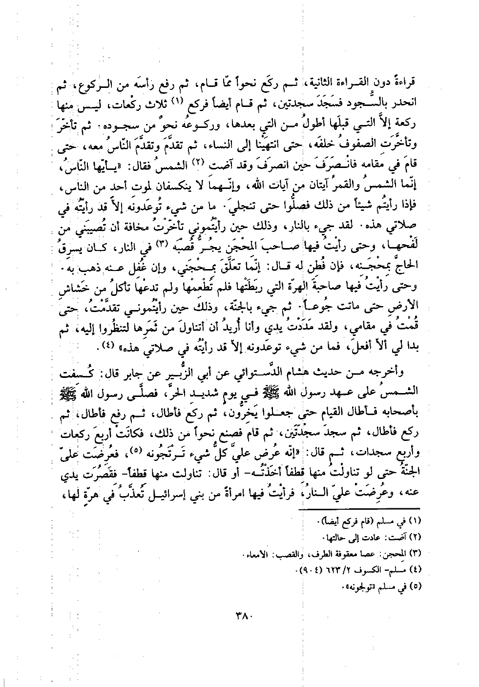كسفت الشَّمْس على عهد رَسُول الله صلى الله عَلَيْهِ وَسلم فِي يومٍ شَدِيد الْحر، فصلى رَسُول الله صلى الله عَلَيْهِ وَسلم بِأَصْحَابِهِ فَأطَال الْقيام حَتَّى جعلُوا يخرون، ثمَّ ركع فَأطَال، ثمَّ رفع فَأطَال، ثمَّ ركع فَأطَال، ثمَّ سجد سَجْدَتَيْنِ، ثمَّ قَامَ فَصنعَ نَحوا من ذَلِك، فَكَانَت أَربع رَكْعَات وَأَرْبع سَجدَات، ثمَّ قَالَ: " إِنَّه عرض عَليّ كل شَيْء ترتجونه، فعرضت عَليّ الْجنَّة حَتَّى لَو تناولت مِنْهَا قطفاً أَخَذته - أَو قَالَ: تناولت مِنْهَا قطفاً - فقصرت يَدي عَنهُ، وَعرضت عَليّ النَّار، فَرَأَيْت فِيهَا امْرَأَة من بني إِسْرَائِيل تعذب فِي هرةٍ لَهَا،