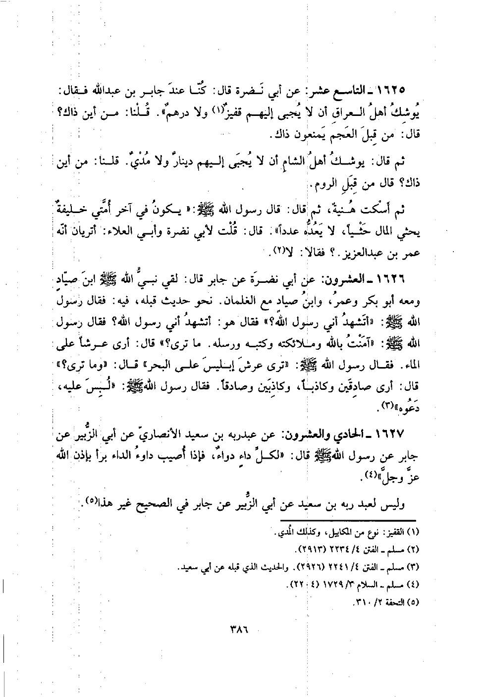 1625 - التَّاسِع عشر: عَن أبي نَضرة قَالَ: كُنَّا عِنْد جَابر بن عبد الله فَقَالَ: يُوشك أهل الْعرَاق أَن لَا يجبى إِلَيْهِم قفيزٌ وَلَا درهمٌ ". قُلْنَا: من أَيْن ذَاك؟ قَالَ: من قبل الْعَجم يمْنَعُونَ ذَاك.