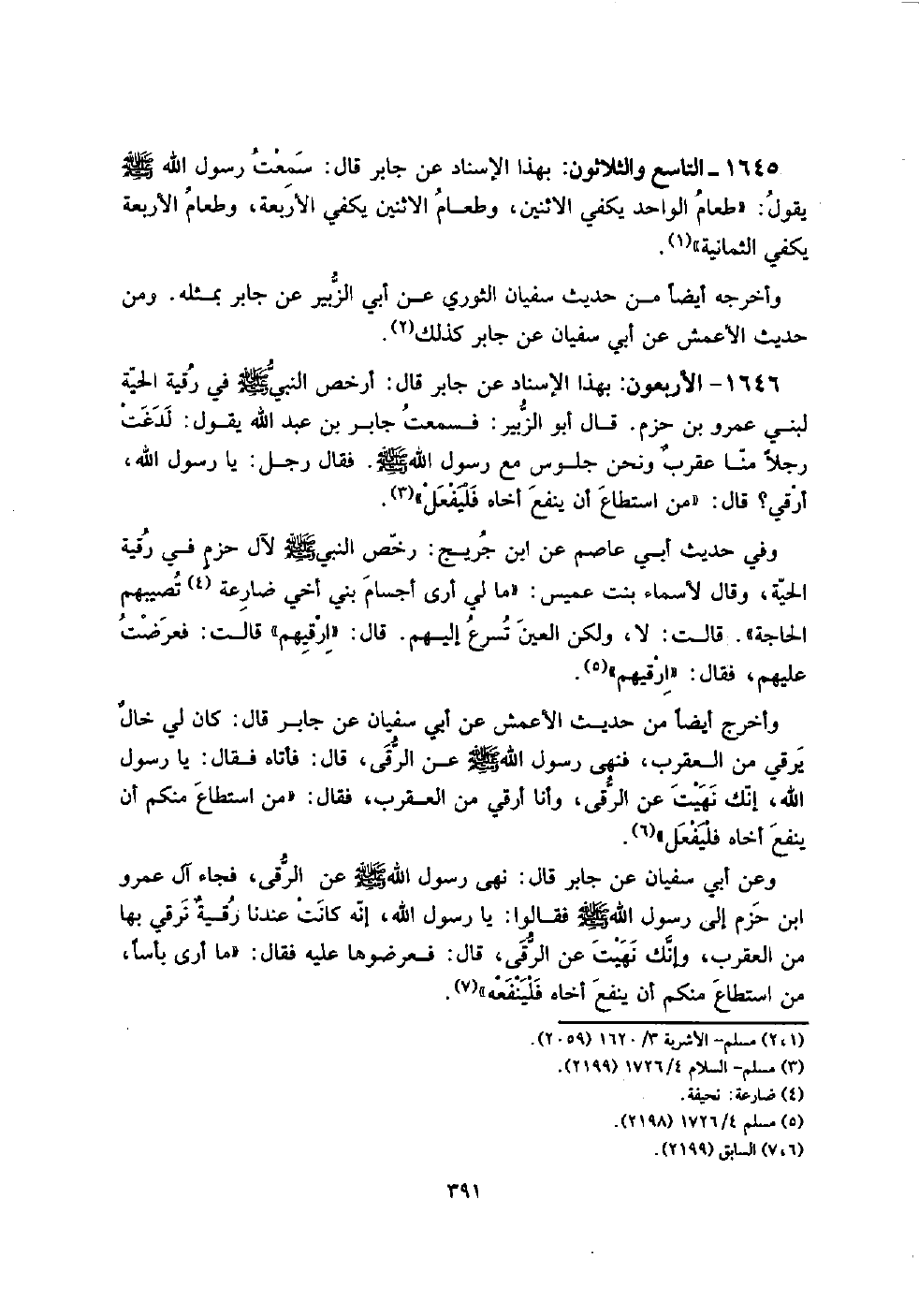1646 - الْأَرْبَعُونَ: بِهَذَا الْإِسْنَاد عَن جَابر قَالَ: أرخص النَّبِي صلى الله عَلَيْهِ وَسلم فِي رقية الْحَيَّة لبني عَمْرو بن حزم. قَالَ أَبُو الزبير: فَسمِعت جَابر بن عبد الله يَقُول: لدغت رجلا منا عقربٌ وَنحن جُلُوس مَعَ رَسُول الله صلى الله عَلَيْهِ وَسلم. فَقَالَ رجل: يَا رَسُول الله، أرقي؟ قَالَ: " من اسْتَطَاعَ أَن ينفع أَخَاهُ فَلْيفْعَل ".