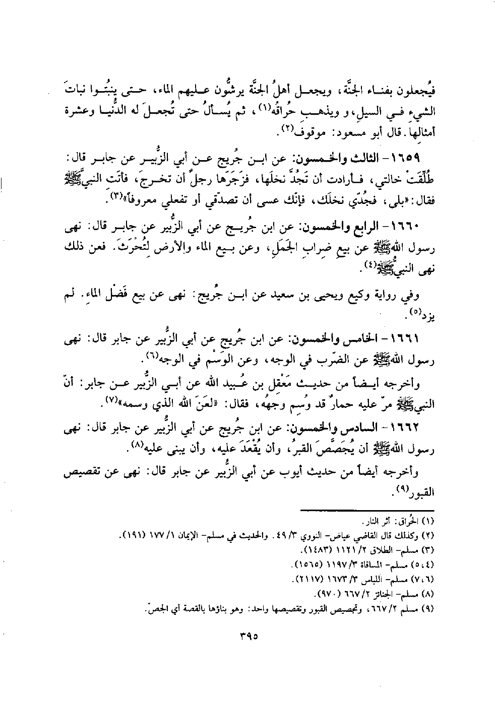 1662 - السَّادِس وَالْخَمْسُونَ: عَن ابْن جريج عَن أبي الزبير عَن جَابر قَالَ: نهى رَسُول الله صلى الله عَلَيْهِ وَسلم أَن يجصص الْقَبْر، وَأَن يقْعد عَلَيْهِ، وَأَن يبْنى عَلَيْهِ.