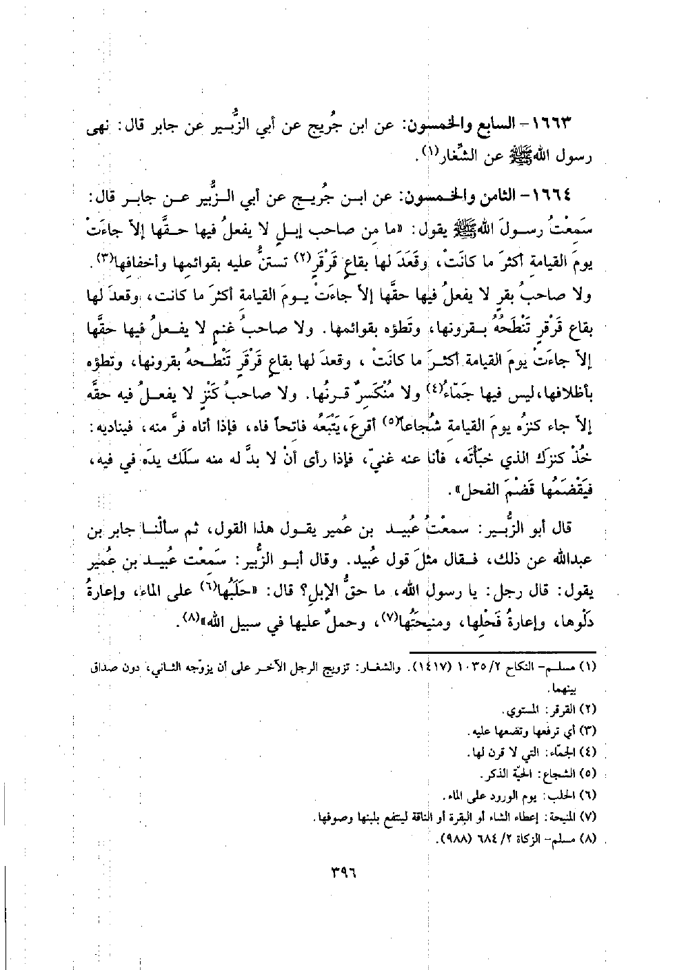 1664 - الثَّامِن وَالْخَمْسُونَ: عَن ابْن جريج عَن أبي الزبير عَن جَابر قَالَ: سَمِعت رَسُول الله صلى الله عَلَيْهِ وَسلم يَقُول: " مَا من صَاحب إبلٍ لَا يفعل فِيهَا حَقّهَا إِلَّا جَاءَت يَوْم الْقِيَامَة أَكثر مَا كَانَت، وَقعد لَهَا بقاعٍ قرقرٍ تستن عَلَيْهِ بقوائمها وأخفافها.