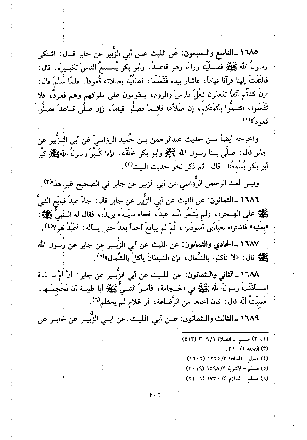 1687 - الْحَادِي وَالثَّمَانُونَ: عَن اللَّيْث عَن أبي الزبير عَن جَابر عَن رَسُول الله صلى الله عَلَيْهِ وَسلم قَالَ: " لَا تَأْكُلُوا بالشمال، فَإِن الشَّيْطَان يَأْكُل بالشمال ".