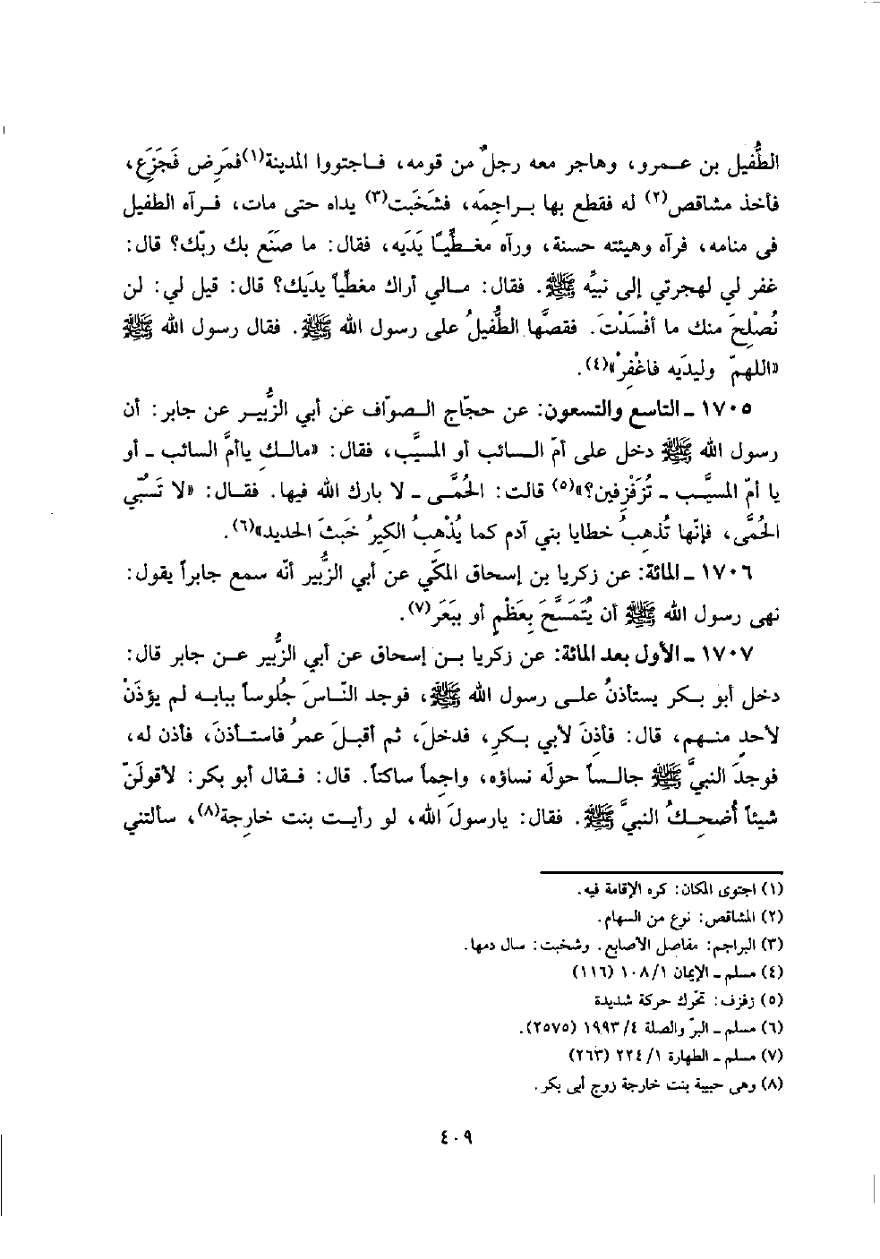 1705 - التَّاسِع وَالتِّسْعُونَ: عَن حجاج الصَّواف عَن أبي الزبير عَن جَابر: أَن رَسُول الله صلى الله عَلَيْهِ وَسلم دخل على أم السَّائِب أَو الْمسيب، فَقَالَ: " مَالك يَا أم السَّائِب - أَو يَا أم الْمسيب - تزفزفين؟ " قَالَت: الْحمى - لَا بَارك الله فِيهَا. فَقَالَ: " لَا تسبي الْحمى، فَإِنَّهَا تذْهب خَطَايَا بني آدم كَمَا يذهب الْكِير خبث الْحَدِيد ".