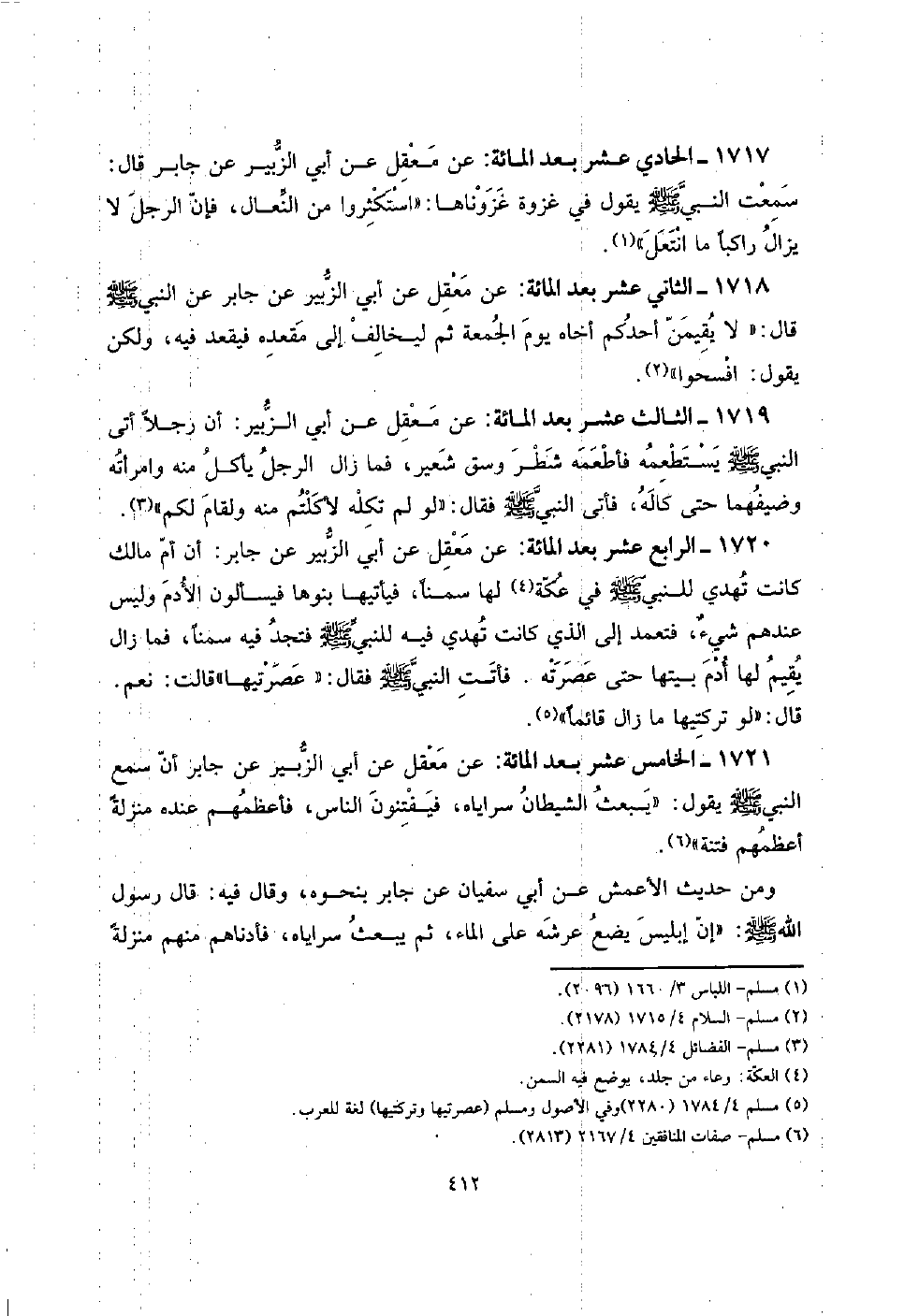 1717 - الْحَادِي عشر بعد الْمِائَة: عَن معقل عَن أبي الزبير عَن جَابر قَالَ: سَمِعت النَّبِي صلى الله عَلَيْهِ وَسلم يَقُول فِي غَزْوَة غزوناها: " استكثروا من النِّعَال، فَإِن الرجل لَا يزَال رَاكِبًا مَا انتعل ".