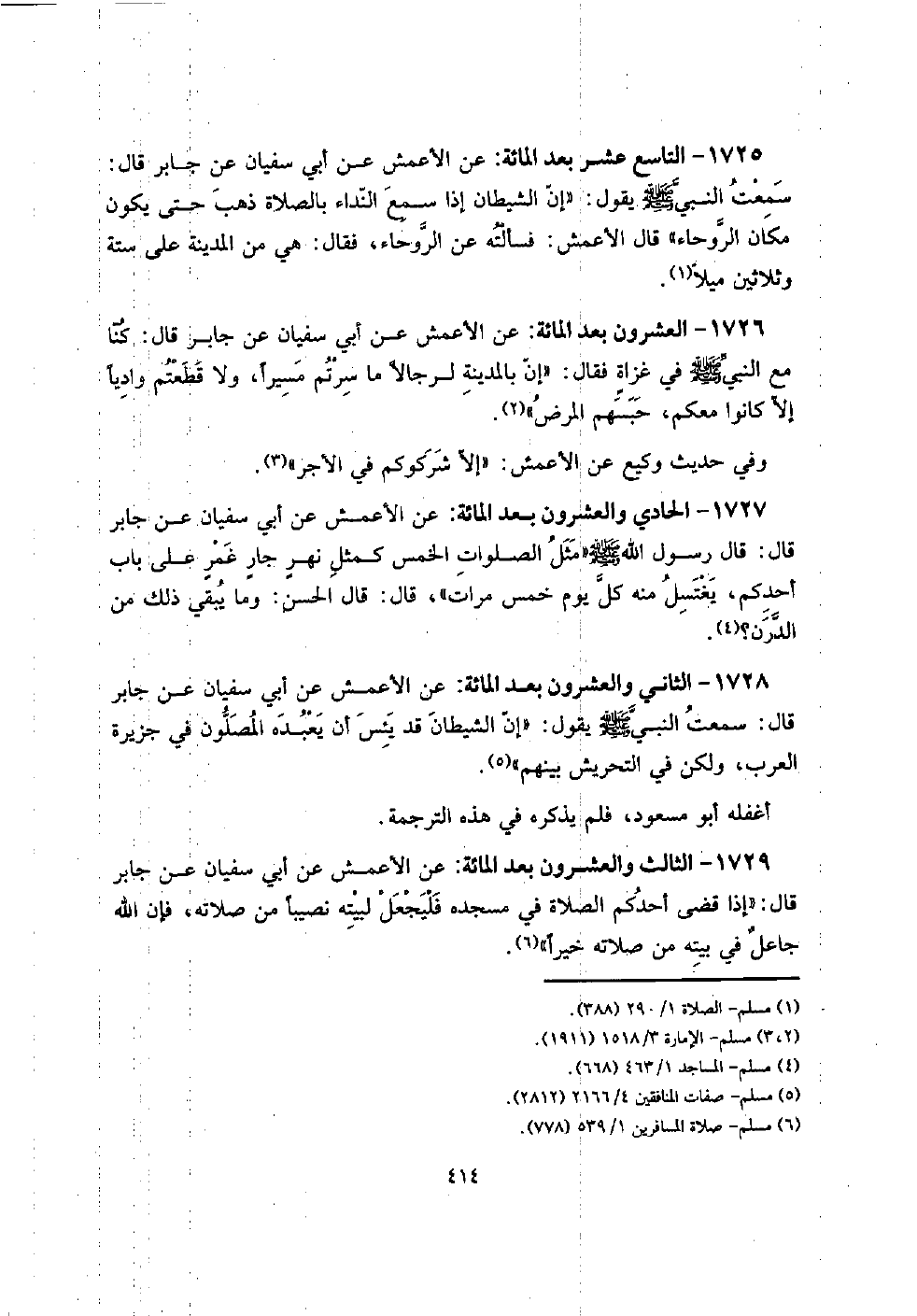 1725 - التَّاسِع عشر بعد الْمِائَة: عَن الْأَعْمَش عَن أبي سُفْيَان عَن جَابر قَالَ: سَمِعت النَّبِي صلى الله عَلَيْهِ وَسلم يَقُول: " إِن الشَّيْطَان إِذا سمع النداء بِالصَّلَاةِ ذهب حَتَّى يكون مَكَان الروحاء " قَالَ الْأَعْمَش: فَسَأَلته عَن الروحاء، فَقَالَ: هِيَ من الْمَدِينَة على سِتَّة وَثَلَاثِينَ ميلًا.