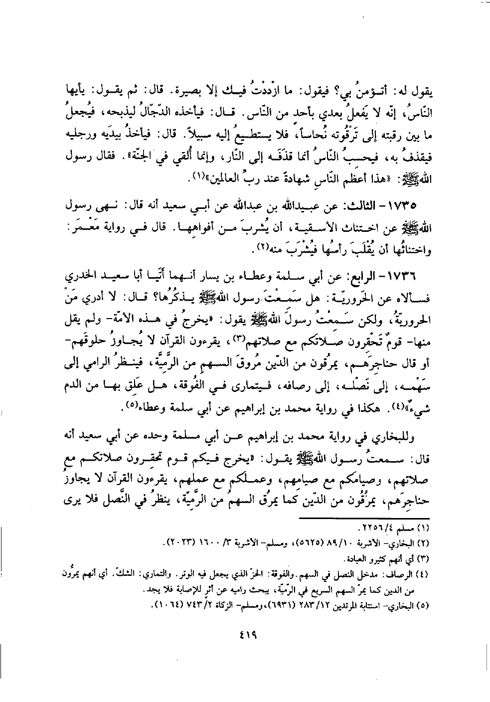 1736 - الرَّابِع: عَن أبي سَلمَة وَعَطَاء بن يسَار أَنَّهُمَا أَتَيَا أَبَا سعيد الْخُدْرِيّ فَسَأَلَاهُ عَن الحرورية: هَل سَمِعت رَسُول الله صلى الله عَلَيْهِ وَسلم يذكرهَا؟ قَالَ: لَا أَدْرِي من الحرورية، وَلَكِن سَمِعت رَسُول الله صلى الله عَلَيْهِ وَسلم يَقُول: " يخرج فِي هَذِه الْأمة - وَلم يقل مِنْهَا - قومٌ تحقرون صَلَاتكُمْ مَعَ صلَاتهم، يقرءُون الْقُرْآن لَا يُجَاوز حُلُوقهمْ - أَو قَالَ حَنَاجِرهمْ، يَمْرُقُونَ من الدّين مروق السهْم من الرَّمية، فَينْظر الرَّامِي إِلَى سَهْمه، إِلَى نصله، إِلَى رصافه، فيتمارى فِي الفوقة، هَل علق بهَا من الدَّم شيءٌ ". هَكَذَا فِي رِوَايَة مُحَمَّد بن إِبْرَاهِيم عَن أبي سَلمَة وَعَطَاء.