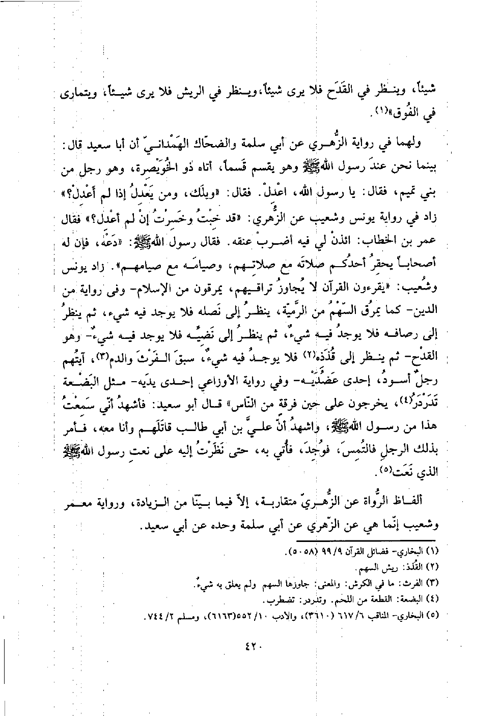 بَيْنَمَا نَحن عِنْد رَسُول الله صلى الله عَلَيْهِ وَسلم وَهُوَ يقسم قسما، أَتَاهُ ذُو الْخوَيْصِرَة، وَهُوَ رجل من بني تَمِيم، فَقَالَ: يَا رَسُول الله، اعْدِلْ. فَقَالَ: " وَيلك، وَمن يعدل إِذا لم أعدل؟ " زَاد فِي رِوَايَة يُونُس وَشُعَيْب عَن الزُّهْرِيّ: " قد خبت وخسرت إِن لم أعدل؟ " فَقَالَ عمر بن الْخطاب: ائْذَنْ لي فِيهِ أضْرب عُنُقه. فَقَالَ رَسُول الله صلى الله عَلَيْهِ وَسلم: " دَعه، فَإِن لَهُ أصحاباً يحقر أحدكُم صلَاته مَعَ صلَاتهم، وصيامه مَعَ صِيَامهمْ ". زَاد يُونُس وَشُعَيْب: " يقرءُون الْقُرْآن لَا يُجَاوز تراقيهم، يَمْرُقُونَ من الْإِسْلَام - وَفِي رِوَايَة من الدّين - كَمَا يَمْرُق السهْم من الرَّمية، ينظر إِلَى نصله فَلَا يُوجد فِيهِ شَيْء، ثمَّ ينظر إِلَى رصافه فَلَا يُوجد فِيهِ شيءٌ، ثمَّ ينظر إِلَى نضيه فَلَا يُوجد فِيهِ شيئ - وَهُوَ الْقدح - ثمَّ ينظر إِلَى قذذه فَلَا يُوجد فِيهِ شيءٌ، سبق الفرث وَالدَّم، آيَتهم رجلٌ أسود، إِحْدَى عضديه - وَفِي رِوَايَة الْأَوْزَاعِيّ إِحْدَى يَدَيْهِ - مثل الْبضْعَة تدَرْدر، يخرجُون على حِين فرقةٍ من النَّاس " قَالَ أَبُو سعيد: فَأشْهد أَنِّي سَمِعت هَذَا من رَسُول الله صلى الله عَلَيْهِ وَسلم، واشهد أَن عَليّ بن أبي طَالب قَاتلهم وَأَنا مَعَه، فَأمر بذلك الرجل فالتمس، فَوجدَ، فَأتي بِهِ، حَتَّى نظرت إِلَيْهِ على نعت رَسُول الله صلى الله عَلَيْهِ وَسلم الَّذِي نعت.