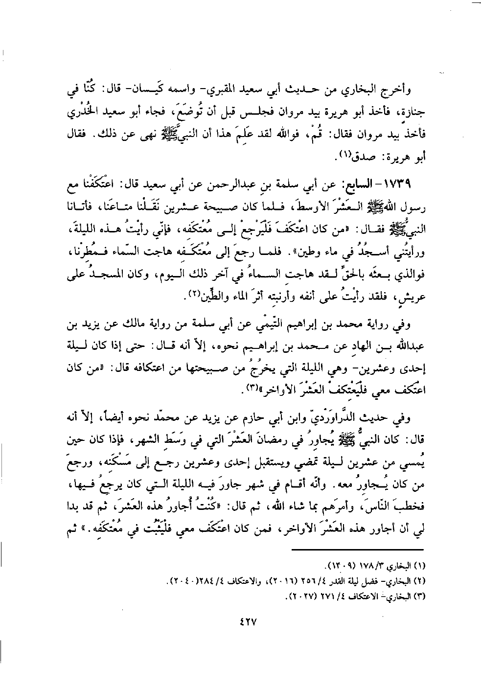 1739 - السَّابِع: عَن أبي سَلمَة بن عبد الرَّحْمَن عَن أبي سعيد قَالَ: اعتكفنا مَعَ رَسُول الله صلى الله عَلَيْهِ وَسلم الْعشْر الْأَوْسَط، فَلَمَّا كَانَ صَبِيحَة عشْرين نقلنا متاعنا، فَأَتَانَا النَّبِي صلى الله عَلَيْهِ وَسلم فَقَالَ: " من كَانَ اعْتكف فَليرْجع إِلَى معكتفه، فَإِنِّي رَأَيْت هَذِه اللَّيْلَة، ورأيتني أَسجد فِي مَاء وطين ". فَلَمَّا رَجَعَ إِلَى مُعْتَكفه هَاجَتْ السَّمَاء فمرطنا، فوالذي بَعثه بِالْحَقِّ لقد هَاجَتْ السَّمَاء فِي آخر ذَلِك الْيَوْم، وَكَانَ الْمَسْجِد على عريشٍ، فَلَقَد رَأَيْت على أَنفه وأرنبته أثر المَاء والطين.