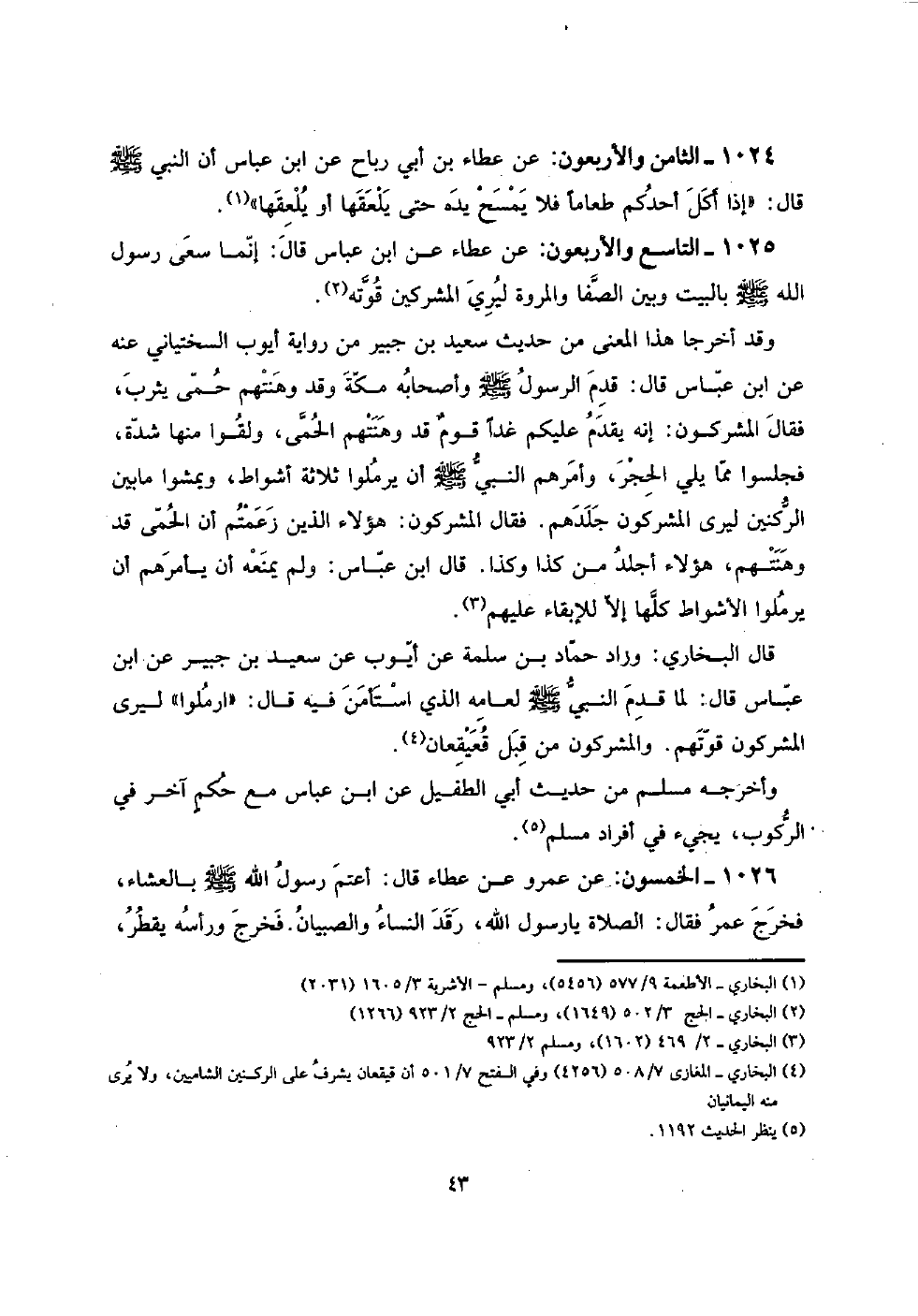 1024 - الثَّامِن وَالْأَرْبَعُونَ: عَن عَطاء بن أبي رَبَاح عَن ابْن عَبَّاس أَن النَّبِي صلى الله عَلَيْهِ وَسلم قَالَ: " إِذا أكل احدكم طَعَاما فَلَا يمسح يَده حَتَّى يلعقها أَو يلعقها ". @ 1025 - التَّاسِع وَالْأَرْبَعُونَ: عَن عَطاء عَن ابْن عَبَّاس قَالَ: إِنَّمَا سعى رَسُول الله صلى الله عَلَيْهِ وَسلم بِالْبَيْتِ وَبَين الصَّفَا والمروة ليري الْمُشْركين قوته.