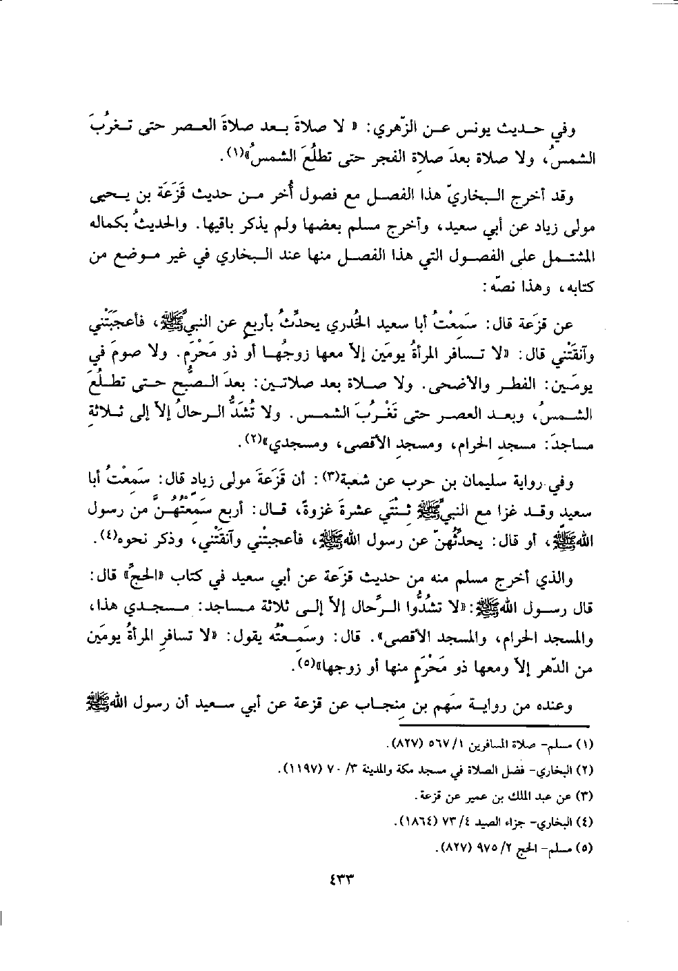 سَمِعت أَبَا سعيد الْخُدْرِيّ يحدث بأربعٍ عَن النَّبِي صلى الله عَلَيْهِ وَسلم، فأعجبتني وآنقتني قَالَ: " لَا تُسَافِر الْمَرْأَة يَوْمَيْنِ إِلَّا مَعهَا زَوجهَا أَو ذُو محرم. وَلَا صَوْم فِي يَوْمَيْنِ: الْفطر والأضحى. وَلَا صَلَاة بعد صَلَاتَيْنِ: بعد الصُّبْح حَتَّى تطلع الشَّمْس، وَبعد الْعَصْر حَتَّى تغرب الشَّمْس. وَلَا تشد الرّحال إِلَّا إِلَى ثَلَاثَة مَسَاجِد: مَسْجِد الْحَرَام، وَمَسْجِد الْأَقْصَى، ومسجدي ".