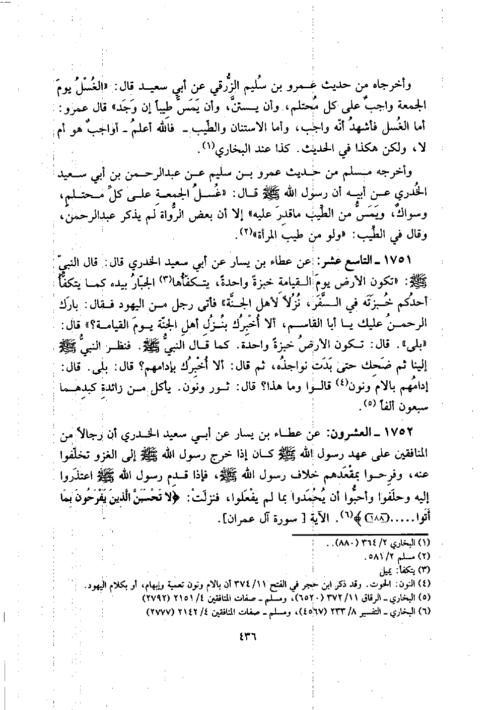 1751 - التَّاسِع عشر: عَن عَطاء بن يسَار عَن أبي سعيد الْخُدْرِيّ قَالَ: قَالَ النَّبِي صلى الله عَلَيْهِ وَسلم: " تكون الأَرْض يَوْم الْقِيَامَة خبْزَة وَاحِدَة، يتكفأها الْجَبَّار بِيَدِهِ كَمَا يَتَكَفَّأ أحدكُم خبزته فِي السّفر، نزلا لأهل الْجنَّة " فَأتى رجل من الْيَهُود فَقَالَ: بَارك الرَّحْمَن عَلَيْك يَا أَبَا الْقَاسِم، أَلا أخْبرك بِنزل أهل الْجنَّة يَوْم الْقِيَامَة؟ " قَالَ: " بلَى ". قَالَ: تكون الأَرْض خبْزَة وَاحِدَة. كَمَا قَالَ النَّبِي صلى الله عَلَيْهِ وَسلم. فَنظر النَّبِي صلى الله عَلَيْهِ وَسلم إِلَيْنَا ثمَّ ضحك حَتَّى بَدَت نَوَاجِذه، ثمَّ قَالَ: أَلا أخْبرك بِإِدَامِهِمْ؟ قَالَ: بلَى. قَالَ: إدَامهمْ بَالَام وَنون قَالُوا وَمَا هَذَا؟ قَالَ: ثَوْر وَنون. يَأْكُل من زَائِدَة كبدهما سَبْعُونَ ألفا.