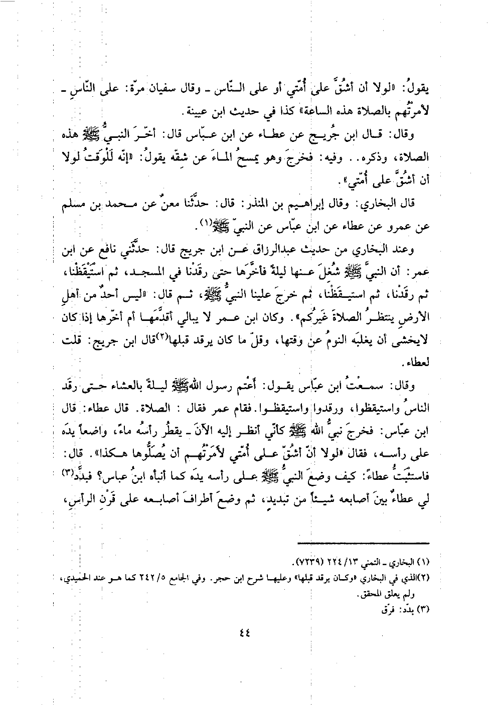سَمِعت ابْن عَبَّاس يَقُول: أعتم رَسُول الله صلى الله عَلَيْهِ وَسلم لَيْلَة بالعشاء حَتَّى رقد النَّاس واستيقظوا، ورقدوا واستيقظوا. فَقَامَ عمر فَقَالَ: الصَّلَاة. قَالَ عَطاء: قَالَ ابْن عَبَّاس: فَخرج نَبِي الله صلى الله عَلَيْهِ وَسلم كَأَنِّي أنظر إِلَيْهِ الْآن - يقطر رَأسه مَاء، وَاضِعا يَده على رَأسه، فَقَالَ " لَوْلَا أَن أشق على أمتِي لأمرتهم أَن يصلوها هَكَذَا ". قَالَ: فاستثبت عَطاء: كَيفَ وضع النَّبِي صلى الله عَلَيْهِ وَسلم على رَأسه يَده كَمَا أنبأه ابْن عَبَّاس؟ فبدد لي عطاءٌ بَين أَصَابِعه شَيْئا من تبديدٍ، ثمَّ وضع أَطْرَاف أَصَابِعه على قرن الرَّأْس،