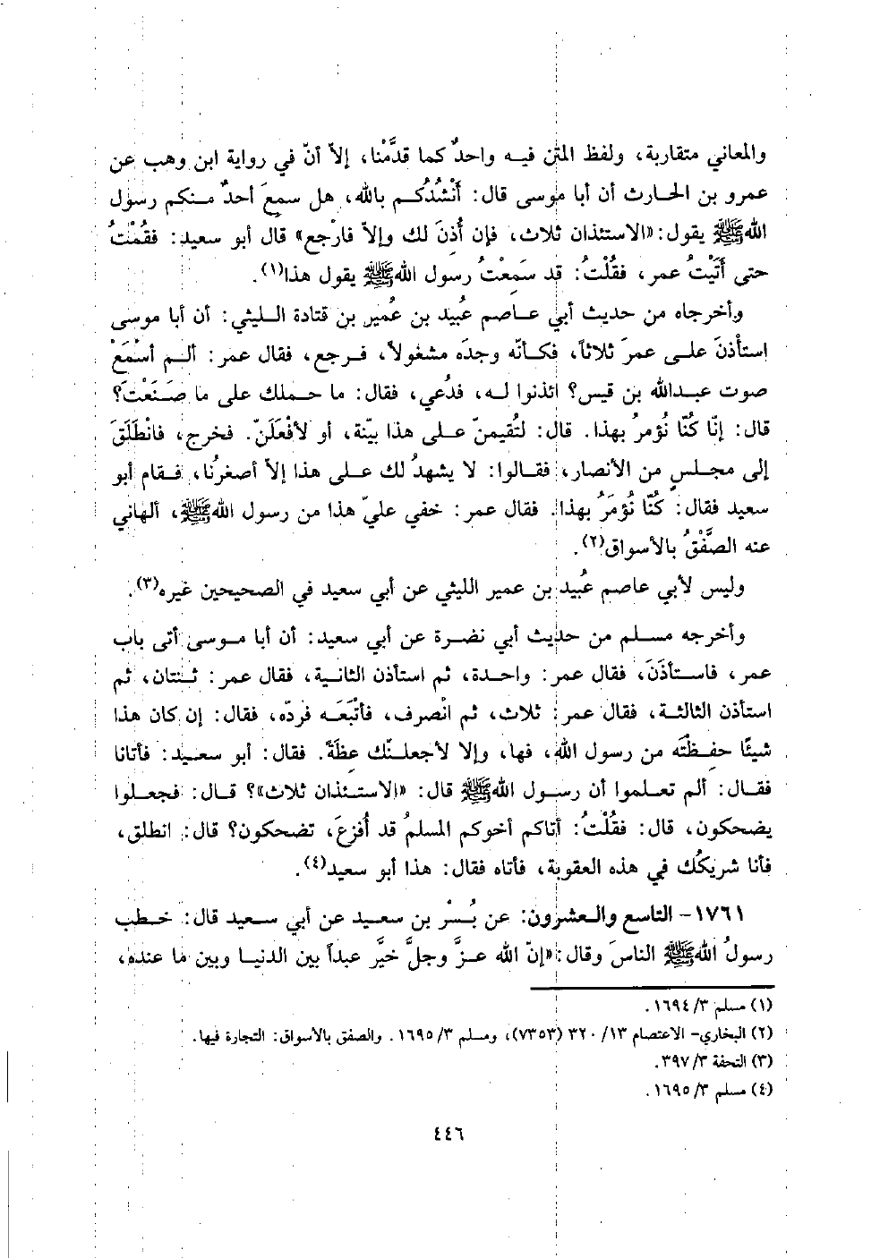 أَن أَبَا مُوسَى اسْتَأْذن على عمر ثَلَاثًا، فَكَأَنَّهُ وجده مَشْغُولًا، فَرجع، فَقَالَ عمر: ألم أسمع صَوت عبد الله بن قيس؟ ائذنوا لَهُ، فدعي، فَقَالَ: مَا حملك على مَا صنعت؟ قَالَ: إِنَّا كُنَّا نؤمر بِهَذَا. قَالَ: لتقيمن على هَذَا بَيِّنَة، أَو لَأَفْعَلَنَّ. فَخرج، فَانْطَلق إِلَى مجلسٍ من الْأَنْصَار، فَقَالُوا: لَا يشْهد لَك على هَذَا إِلَّا أصغرنا، فَقَامَ أَبُو سعيد فَقَالَ: كُنَّا نؤمر بِهَذَا. فَقَالَ عمر: خَفِي عَليّ هَذَا من رَسُول الله صلى الله عَلَيْهِ وَسلم، ألهاني عَنهُ الصفق بالأسواق.