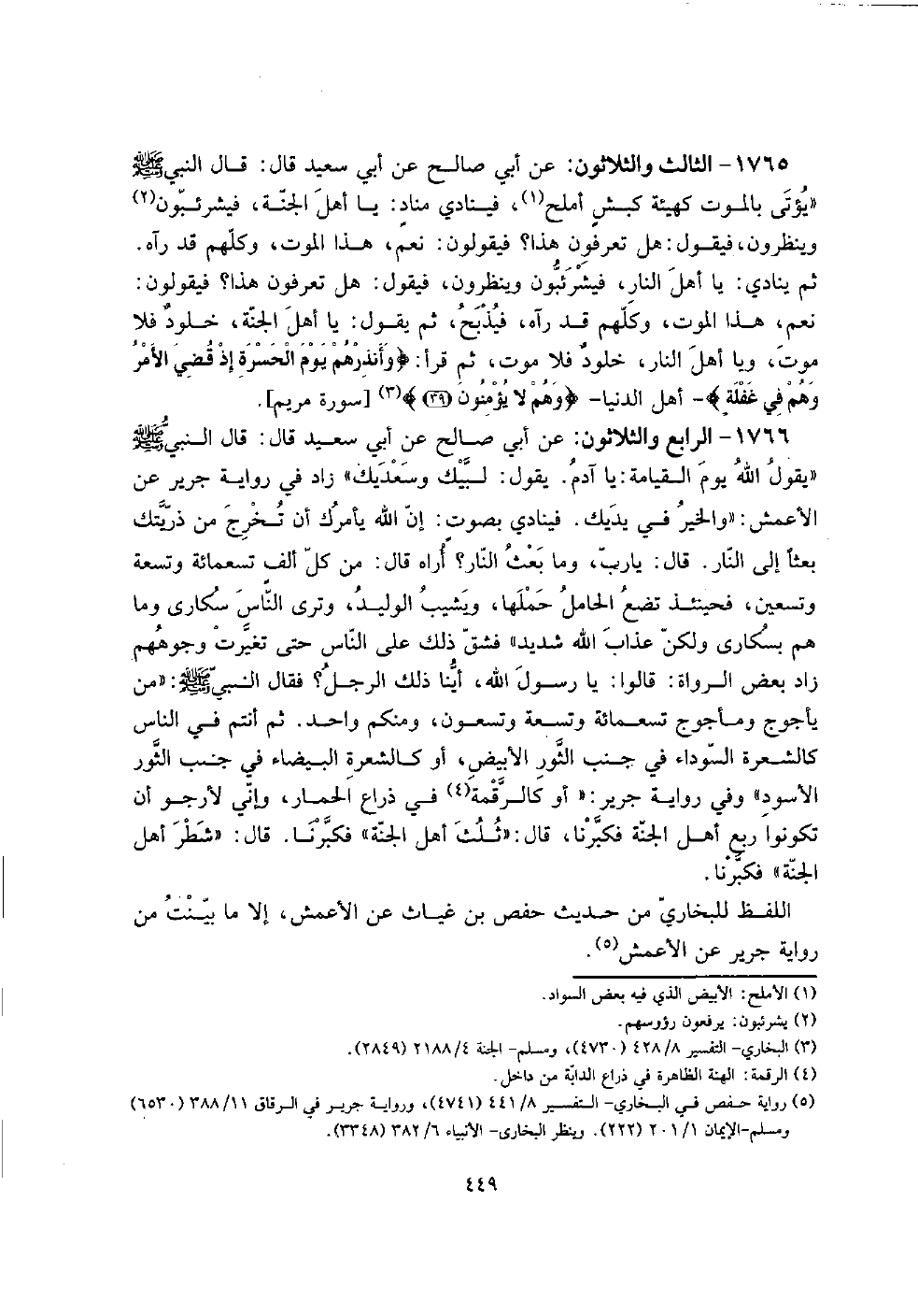 1765 - الثَّالِث وَالثَّلَاثُونَ: عَن أبي صَالح عَن أبي سعيد قَالَ: قَالَ النَّبِي صلى الله عَلَيْهِ وَسلم " يُؤْتى بِالْمَوْتِ كَهَيئَةِ كبشٍ أَمْلَح، فينادي منادٍ " يَا أهل الْجنَّة، فَيَشْرَئِبُّونَ وَيَنْظُرُونَ، فَيَقُول: هَل تعرفُون هَذَا؟ فَيَقُولُونَ: نعم، هَذَا الْمَوْت، وَكلهمْ قد رَآهُ.