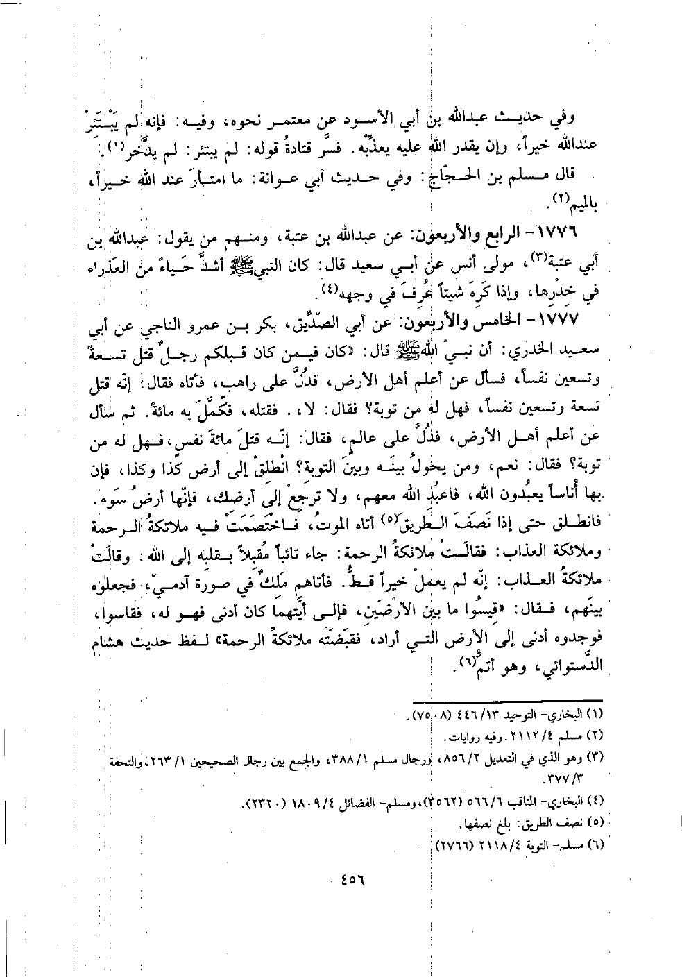 1777 - الْخَامِس وَالْأَرْبَعُونَ: عَن أبي الصّديق، بكر بن عَمْرو النَّاجِي عَن أبي سعيد الْخُدْرِيّ: أَن نَبِي الله صلى الله عَلَيْهِ وَسلم قَالَ: " كَانَ فِيمَن كَانَ قبلكُمْ رجلٌ قتل تِسْعَة وَتِسْعين نفسا، فَسَأَلَ عَن أعلم أهل الأَرْض، فَدلَّ على رَاهِب، فَأَتَاهُ فَقَالَ: إِنَّه قتل تِسْعَة وَتِسْعين نفسا، فَهَل لَهُ من تَوْبَة؟ فَقَالَ: لَا،. فَقتله، فكمل بِهِ مائَة. ثمَّ سَأَلَ عَن أعلم أهل الأَرْض، فَدلَّ على عالمٍ، فَقَالَ: إِنَّه قتل مائَة نفسٍ، فَهَل لَهُ من تَوْبَة؟ فَقَالَ: نعم، وَمن يحول بَينه وَبَين التَّوْبَة؟ انْطلق إِلَى أَرض كَذَا وَكَذَا، فَإِن بهَا أُنَاسًا يعْبدُونَ الله، فاعبد الله مَعَهم، وَلَا ترجع إِلَى أَرْضك، فَإِنَّهَا أَرض سوء.