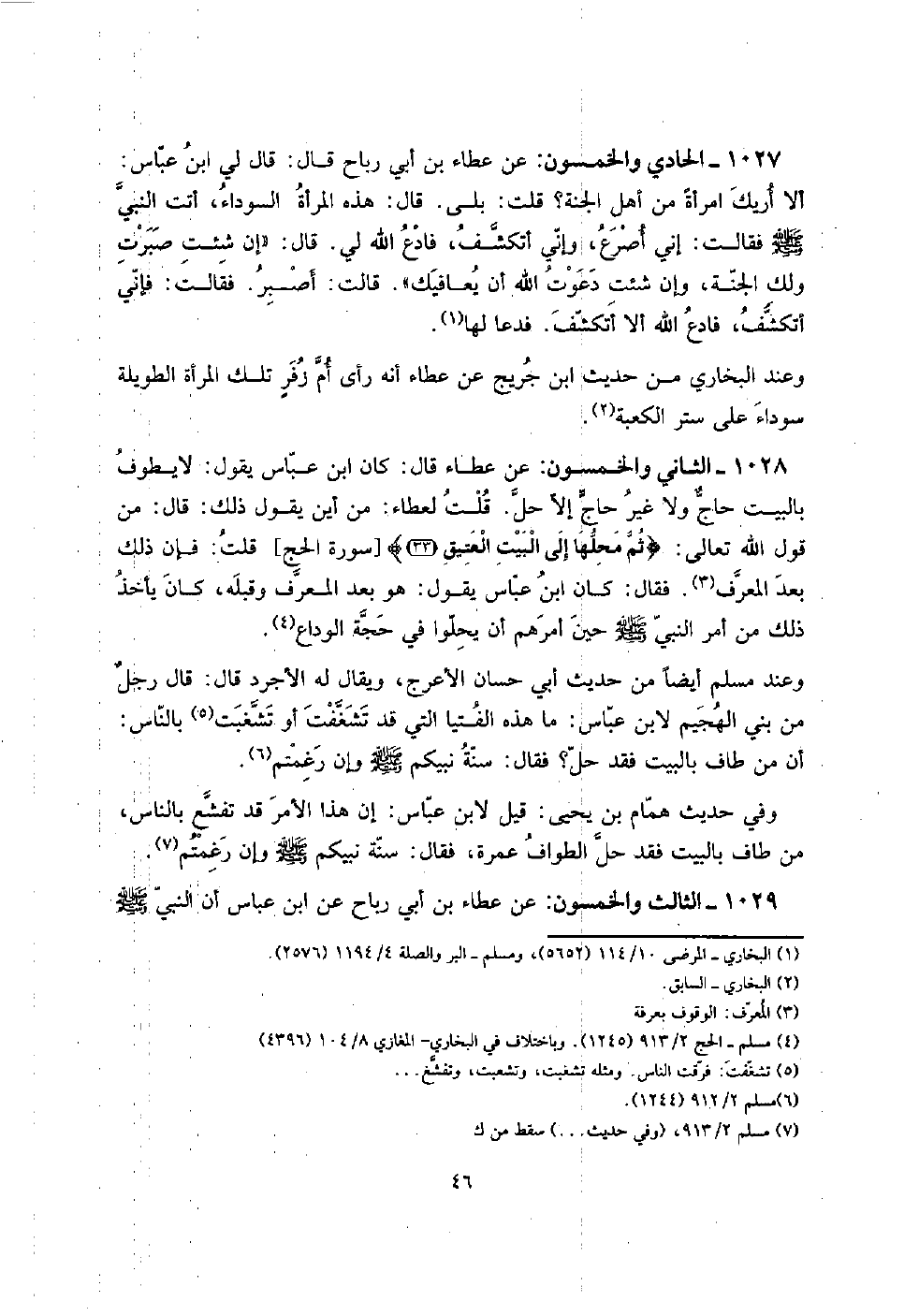 1027 - الْحَادِي وَالْخَمْسُونَ: عَن عَطاء بن أبي رَبَاح قَالَ: قَالَ لي ابْن عَبَّاس: أَلا أريك امْرَأَة من أهل الْجنَّة؟ قلت: بلَى. قَالَ: هَذِه الْمَرْأَة السَّوْدَاء، أَتَت النَّبِي صلى الله عَلَيْهِ وَسلم فَقَالَت: إِنِّي أصرع، وَإِنِّي أتكشف، فَادع الله لي. قَالَ: " إِن شِئْت صبرت وَلَك الْجنَّة، وَإِن شِئْت دَعَوْت الله أَن يعافيك ". قَالَت: أَصْبِر. فَقَالَت: فَإِنِّي أتكشف، فَادع الله أَلا أتكشف. فَدَعَا لَهَا.