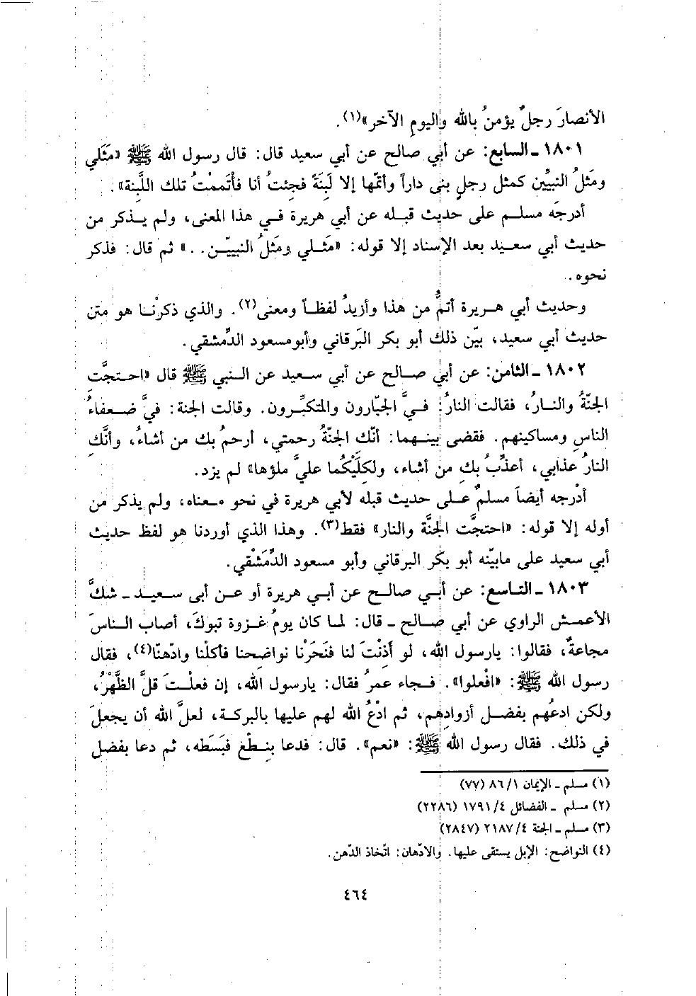 وَحَدِيث أبي هُرَيْرَة أتم من هَذَا وأزيد لفظا وَمعنى. وَالَّذِي ذكرنَا هُوَ متن حَدِيث أبي سعيد، بَين ذَلِك أَبُو بكر البرقاني وَأَبُو مَسْعُود الدِّمَشْقِي. 1802 - الثَّامِن: عَن أبي صَالح عَن أبي سعيد عَن النَّبِي صلى الله عَلَيْهِ وَسلم قَالَ " احتجت الْجنَّة وَالنَّار، فَقَالَت النَّار: فِي الجبارون والمتكبرون. وَقَالَت الْجنَّة: فِي ضعفاء النَّاس ومساكينهم. فَقضى بَينهمَا: أَنَّك الْجنَّة رَحْمَتي، أرْحم بك من أَشَاء، وَأَنَّك النَّار عَذَابي، أعذب بك من أَشَاء، ولكليكما عَليّ ملؤُهَا " لم يزدْ.