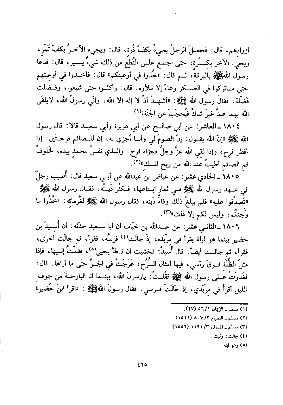 1806 - الثَّانِي عشر: عَن عبد الله بن خباب أَن أَبَا سعيد حَدثهُ: أَن أسيد بن حضير بَيْنَمَا هُوَ لَيْلَة يقْرَأ فِي مربده، إِذْ جالت فرسه، فَقَرَأَ، ثمَّ جالت أُخْرَى، فَقَرَأَ، ثمَّ جالت أَيْضا. قَالَ أسيدٌ: فَخَشِيت أَن تطَأ يحيى، فَقُمْت إِلَيْهَا، فَإِذا مثل الظلة فَوق رَأْسِي، فِيهَا أَمْثَال السرج، عرجت فِي الجو حَتَّى مَا أَرَاهَا. قَالَ: فَغَدَوْت على رَسُول الله صلى الله عَلَيْهِ وَسلم فَقلت: يَا رَسُول الله، بَيْنَمَا أَنا البارحة من جَوف اللَّيْل اقْرَأ فِي مربدي، إِذْ جالت فرسي. فَقَالَ رَسُول الله صلى الله عَلَيْهِ وَسلم: " اقْرَأ ابْن حضير "