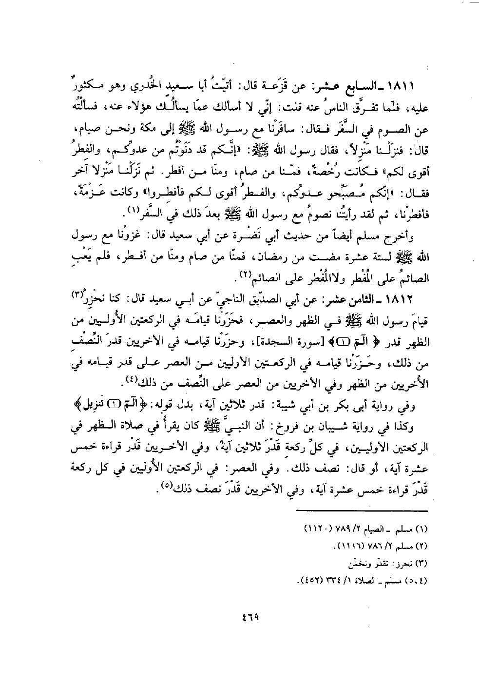 1812 - الثَّامِن عشر: عَن أبي الصّديق النَّاجِي عَن أبي سعيد قَالَ: كُنَّا نحزر قيام رَسُول الله صلى الله عَلَيْهِ وَسلم فِي الظّهْر وَالْعصر، فحزرنا قِيَامه فِي الرَّكْعَتَيْنِ الْأَوليين من الظّهْر قدر {الم} [سُورَة السَّجْدَة] ، وحزرنا قِيَامه فِي الْأُخْرَيَيْنِ قدر النّصْف من ذَلِك، وحزرنا قِيَامه فِي الرَّكْعَتَيْنِ الْأَوليين من الْعَصْر على قدر قِيَامه فِي الْأُخْرَيَيْنِ من الظّهْر وَفِي الْأُخْرَيَيْنِ من الْعَصْر على النّصْف من ذَلِك.