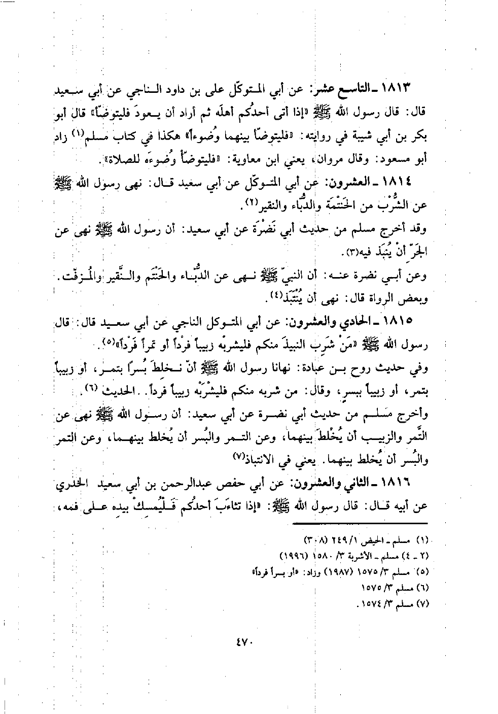 1815 - الْحَادِي وَالْعشْرُونَ: عَن أبي المتَوَكل النَّاجِي عَن أبي سعيد قَالَ: قَالَ رَسُول الله صلى الله عَلَيْهِ وَسلم " من شرب النَّبِيذ مِنْكُم فليشربه زبيباً فَردا أَو تَمرا فَردا ".