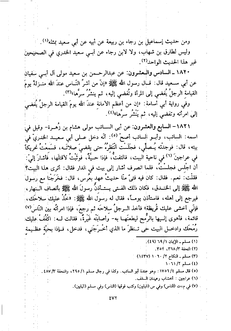 1821 - السَّابِع وَالْعشْرُونَ: عَن أبي السَّائِب مولى هِشَام بن زهرَة - وَقيل فِي اسْمه: السَّائِب، وَأَبُو السَّائِب أصح: أَنه دخل على أبي سعيد الْخُدْرِيّ فِي بَيته، قَالَ: فَوَجَدته يُصَلِّي، فَجَلَست أنتظره حَتَّى يقْضِي صلَاته، فَسمِعت تحريكاً فِي عراجين فِي نَاحيَة الْبَيْت، فَالْتَفت، فَإِذا حيةٌ، فَوَثَبت لأقتلها، فَأَشَارَ إِلَيّ: أَن أَجْلِس فَجَلَست، فَلَمَّا انْصَرف أَشَارَ إِلَى بَيت فِي الدَّار فَقَالَ: أَتَرَى هَذَا الْبَيْت؟ فَقلت: نعم. فَقَالَ: كَانَ فِيهِ فَتى منا حَدِيث عهد بعرس، قَالَ: فخرجنا مَعَ رَسُول الله صلى الله عَلَيْهِ وَسلم إِلَى الخَنْدَق، فَكَانَ ذَلِك الْفَتى يسْتَأْذن رَسُول الله صلى الله عَلَيْهِ وَسلم بأنصاف النَّهَار، فَيرجع إِلَى أَهله، فَاسْتَأْذن يَوْمًا، فَقَالَ لَهُ رَسُول الله صلى الله عَلَيْهِ وَسلم: " خُذ عَلَيْك سِلَاحك، فَإِنِّي أخْشَى عَلَيْك قُرَيْظَة " فَأخذ الرجل سلاحه ثمَّ رَجَعَ، فَإِذا امْرَأَته بَين النَّاس قَائِمَة، فَأَهوى إِلَيْهَا بِالرُّمْحِ ليطعنها بِهِ - وأصابته غيرةٌ، فَقَالَت لَهُ: اكفف عَلَيْك رمحك وادخل الْبَيْت حَتَّى تنظر مَا الَّذِي أخرجني، فَدخل، فَإِذا بحيةٍ عظيمةٍ