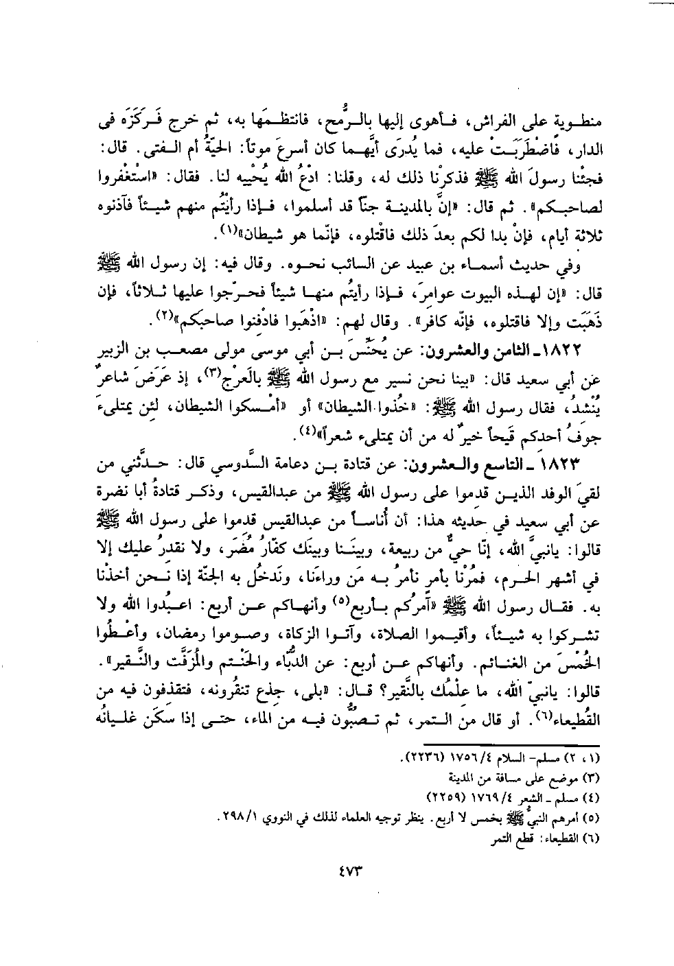 1823 - التَّاسِع وَالْعشْرُونَ: عَن قَتَادَة بن دعامة السدُوسِي قَالَ: حَدثنِي من لَقِي الْوَفْد الَّذين قدمُوا على رَسُول الله صلى الله عَلَيْهِ وَسلم من عبد الْقَيْس، وَذكر قَتَادَة أَبَا نَضرة عَن أبي سعيد فِي حَدِيثه هَذَا: أَن أُنَاسًا من عبد الْقَيْس قدمُوا على رَسُول الله صلى الله عَلَيْهِ وَسلم قَالُوا: يَا نَبِي الله، إِنَّا حيٌّ من ربيعَة، وبيننا وَبَيْنك كفار مُضر، وَلَا نقدر عَلَيْك إِلَّا فِي أشهر الْحرم، فمرنا بأمرٍ نأمر بِهِ من وَرَاءَنَا، وندخل بِهِ الْجنَّة إِذا نَحن أَخذنَا بِهِ. فَقَالَ رَسُول الله صلى الله عَلَيْهِ وَسلم " آمركُم بِأَرْبَع وأنهاكم عَن أَربع: اعبدوا الله وَلَا تُشْرِكُوا بِهِ شَيْئا، وَأقِيمُوا الصَّلَاة، وَآتوا الزَّكَاة، وصوموا رَمَضَان، وأعطوا الْخمس من الْغَنَائِم. وأنهاكم عَن أَربع: عَن الدُّبَّاء والحنتم والمزفت والنقير ".