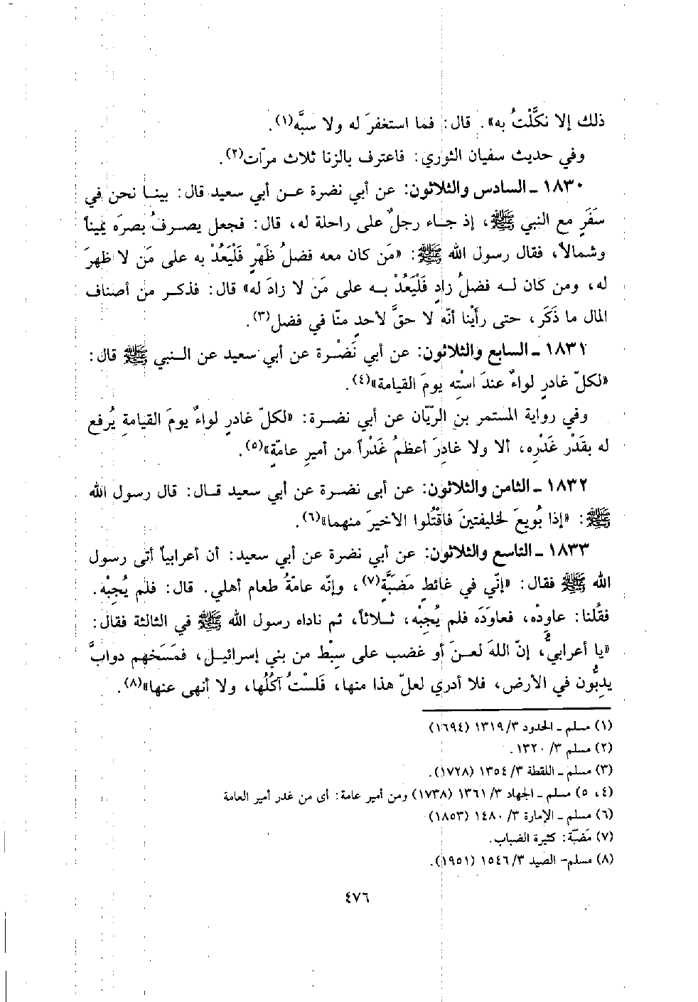 1830 - السَّادِس وَالثَّلَاثُونَ: عَن أبي نَضرة عَن أبي سعيد قَالَ: بَينا نَحن فِي سفرٍ مَعَ النَّبِي صلى الله عَلَيْهِ وَسلم، إِذْ جَاءَ رجلٌ على رَاحِلَة لَهُ، قَالَ: فَجعل يصرف بَصَره يَمِينا وَشمَالًا، فَقَالَ رَسُول الله صلى الله عَلَيْهِ وَسلم: " من كَانَ مَعَه فضل ظهرٍ فليعد بِهِ على من لَا ظهر لَهُ، وَمن كَانَ لَهُ فضل زادٍ فليعد بِهِ على من لَا زَاد لَهُ " قَالَ: فَذكر من أَصْنَاف المَال مَا ذكر، حَتَّى رَأينَا أَنه لَا حق لأحدٍ منا فِي فضل.