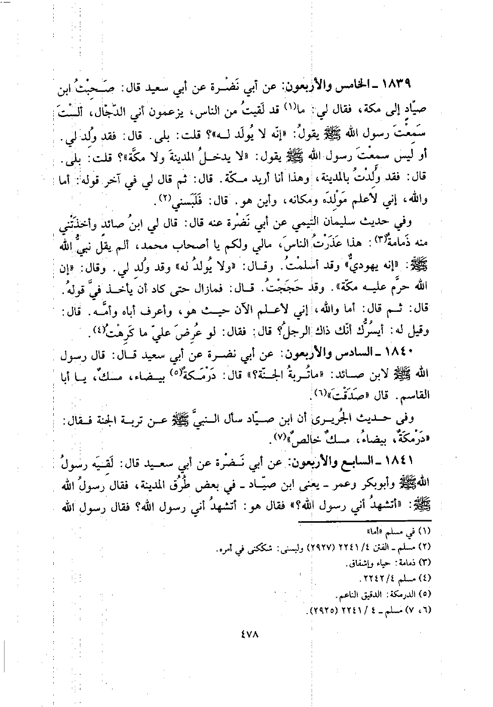 1839 - الْخَامِس وَالْأَرْبَعُونَ: عَن أبي نَضرة عَن أبي سعيد قَالَ: صَحِبت ابْن صياد إِلَى مَكَّة، فَقَالَ لي: مَا قد لقِيت من النَّاس، يَزْعمُونَ أَنِّي الدَّجَّال، أَلَسْت سَمِعت رَسُول الله صلى الله عَلَيْهِ وَسلم يَقُول: " إِنَّه لَا يُولد لَهُ "؟ قلت: بلَى. قَالَ: فقد ولد لي.