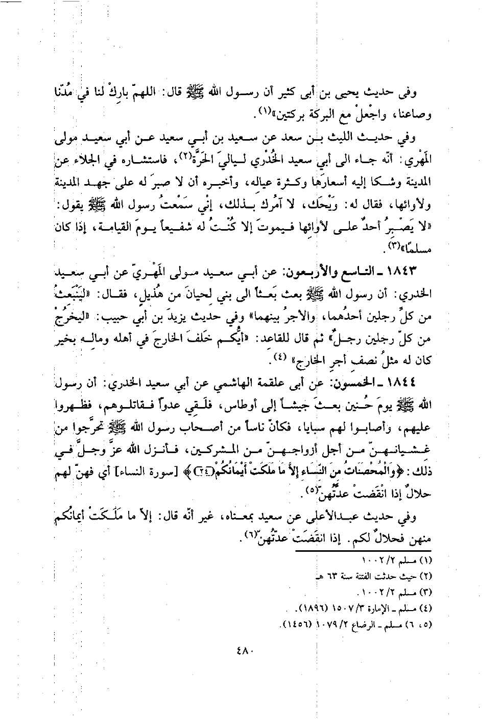 1844 - الْخَمْسُونَ: عَن أبي عَلْقَمَة الْهَاشِمِي عَن أبي سعيد الْخُدْرِيّ: أَن رَسُول الله صلى الله عَلَيْهِ وَسلم يَوْم حنين بعث جَيْشًا إِلَى أَوْطَاس، فلقي عدوا فقاتلوهم، فظهروا عَلَيْهِم، وَأَصَابُوا لَهُم سَبَايَا، فَكَأَن نَاسا من أَصْحَاب رَسُول الله صلى الله عَلَيْهِ وَسلم تحرجوا من غشيانهن من أجل أَزوَاجهنَّ من الْمُشْركين، فَأنْزل الله عز وَجل فِي ذَلِك: {وَالْمُحصنَات من النِّسَاء إِلَّا مَا ملكت أَيْمَانكُم} [سُورَة النِّسَاء] أَي فهن لَهُم حلالٌ إِذا انْقَضتْ عدتهن.