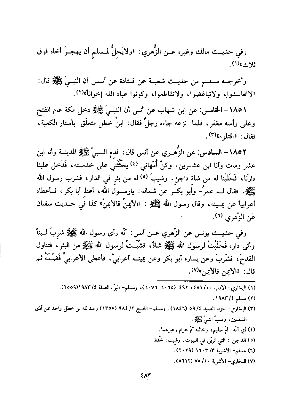 1852 - السَّادِس: عَن الزُّهْرِيّ عَن أنس قَالَ: قدم النَّبِي صلى الله عَلَيْهِ وَسلم الْمَدِينَة وَأَنا ابْن عشر وَمَات وَأَنا ابْن عشْرين، وَكن أمهاتي يحثثني على خدمته، فَدخل علينا دَارنَا، فحلبنا لَهُ من شاةٍ داجنٍ، وشيب لَهُ من بئرٍ فِي الدَّار، فَشرب رَسُول الله صلى الله عَلَيْهِ وَسلم، فَقَالَ لَهُ عمر - وَأَبُو بكر عَن شِمَاله: يَا رَسُول الله، أعْط أَبَا بكر، فَأعْطَاهُ أَعْرَابِيًا عَن يَمِينه، وَقَالَ رَسُول الله صلى الله عَلَيْهِ وَسلم: " الْأَيْمن فالأيمن " كَذَا فِي حَدِيث سُفْيَان عَن الزُّهْرِيّ.