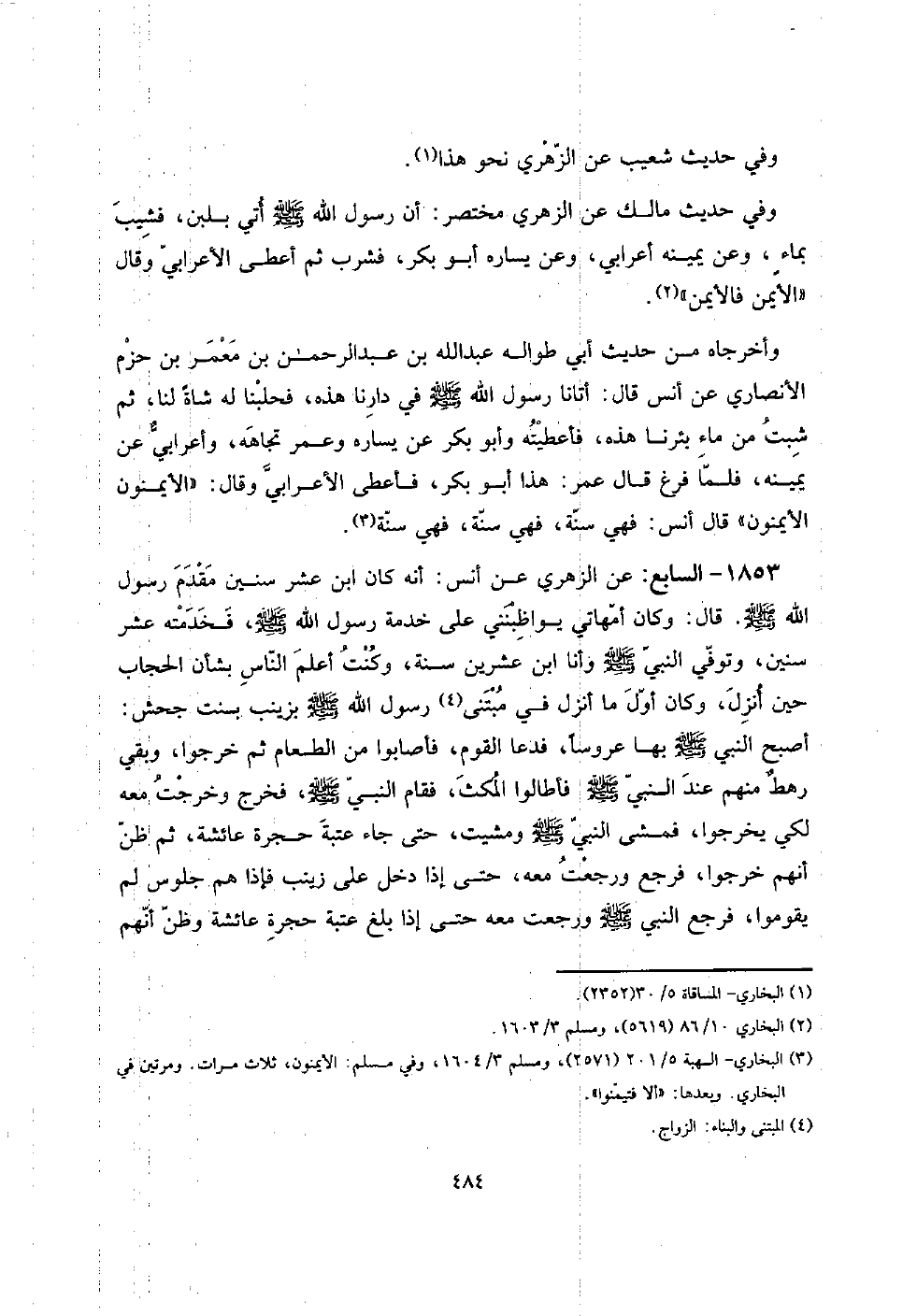 1853 - السَّابِع: عَن الزُّهْرِيّ عَن أنس: أَنه كَانَ ابْن عشر سِنِين مقدم رَسُول الله صلى الله عَلَيْهِ وَسلم. قَالَ: وَكَانَ أمهاتي يواظبنني على خدمَة رَسُول الله صلى الله عَلَيْهِ وَسلم، فخدمته عشر سِنِين، وَتُوفِّي النَّبِي صلى الله عَلَيْهِ وَسلم وَأَنا ابْن عشْرين سنة، وَكنت أعلم النَّاس بشأن الْحجاب حِين أنزل، وَكَانَ أول مَا أنزل فِي مبتنى رَسُول الله صلى الله عَلَيْهِ وَسلم بِزَيْنَب بنت جحش: أصبح النَّبِي صلى الله عَلَيْهِ وَسلم بهَا عروساً، فَدَعَا الْقَوْم، فَأَصَابُوا من الطَّعَام ثمَّ خَرجُوا، وَبَقِي رهطٌ مِنْهُم عِنْد النَّبِي صلى الله عَلَيْهِ وَسلم فَأَطَالُوا الْمكْث، فَقَامَ النَّبِي صلى الله عَلَيْهِ وَسلم، فَخرج وَخرجت مَعَه لكَي يخرجُوا، فَمشى النَّبِي صلى الله عَلَيْهِ وَسلم ومشيت، حَتَّى جَاءَ عتبَة حجرَة عَائِشَة، ثمَّ ظن أَنهم خَرجُوا، فَرجع وَرجعت مَعَه، حَتَّى إِذا دخل على زَيْنَب فَإِذا هم جُلُوس لم يقومُوا، فَرجع النَّبِي صلى الله عَلَيْهِ وَسلم وَرجعت مَعَه حَتَّى إِذا بلغ عتبَة حجرَة عَائِشَة وَظن أَنهم