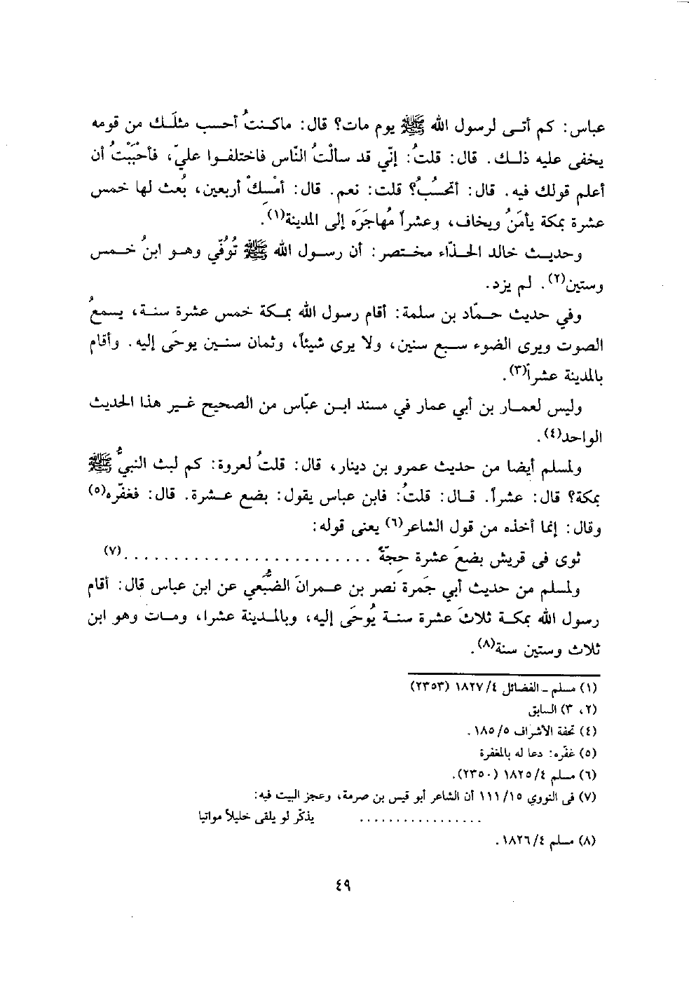 عَبَّاس: كم أَتَى لرَسُول الله صلى الله عَلَيْهِ وَسلم يَوْم مَاتَ؟ قَالَ: مَا كنت أَحسب مثلك من قومه يخفى عَلَيْهِ ذَلِك. قَالَ: قلت: إِنِّي قد سَأَلت النَّاس فَاخْتَلَفُوا عَليّ، فَأَحْبَبْت أَن أعلم قَوْلك فِيهِ. قَالَ: أتحسب؟ قلت: نعم. قَالَ: أمسك أَرْبَعِينَ، بعث لَهَا خمس عشرَة بِمَكَّة يَأْمَن وَيخَاف، وَعشرا مهاجره إِلَى الْمَدِينَة.
