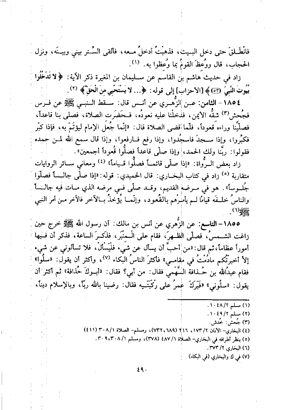 1854 - الثَّامِن: عَن الزُّهْرِيّ عَن أنس قَالَ: سقط النَّبِي صلى الله عَلَيْهِ وَسلم عَن فرس فجحش شقَّه الْأَيْمن، فَدَخَلْنَا عَلَيْهِ نعوده، فَحَضَرت الصَّلَاة، فصلى بِنَا قَاعِدا، فصلينا وَرَاءه قعُودا، فَلَمَّا قضى الصَّلَاة قَالَ: " إِنَّمَا جعل الإِمَام ليؤتم بِهِ، فَإِذا كبر فكبروا، وَإِذا سجد فاسجدوا، وَإِذا رفع فارفعوا، وَإِذا قَالَ سمع الله لمن حَمده فَقولُوا: رَبنَا وَلَك الْحَمد، وَإِذا صلى قَاعِدا فصلوا قعُودا أَجْمَعِينَ ".