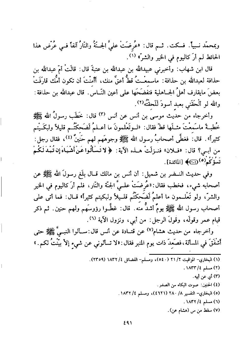 أَن أنس بن مَالك قَالَ بلغ رَسُول الله صلى الله عَلَيْهِ وَسلم عَن أَصْحَابه شَيْء، فَخَطب فَقَالَ: " عرضت عَليّ الْجنَّة وَالنَّار، فَلم أر كَالْيَوْمِ فِي الْخَيْر وَالشَّر، وَلَو تعلمُونَ مَا أعلم لضحكتم قَلِيلا ولبكيتم كثيرا " قَالَ: فَمَا أَتَى على أَصْحَاب رَسُول الله صلى الله عَلَيْهِ وَسلم يومٌ أَشد مِنْهُ. قَالَ: غطوا رؤوسهم وَلَهُم حنين. ثمَّ ذكر قيام عمر وَقَوله، وَقَول الرجل: من أبي، ونزول الْآيَة.