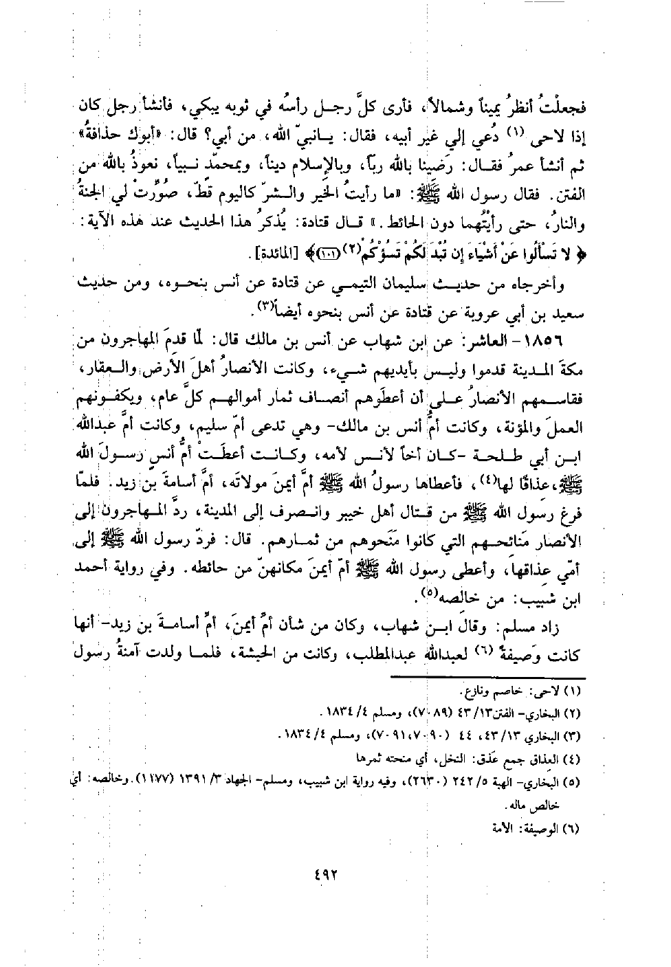 1856 - الْعَاشِر: عَن ابْن شهَاب عَن انس بن مَالك قَالَ: لما قدم الْمُهَاجِرُونَ من مَكَّة الْمَدِينَة قدمُوا وَلَيْسَ بِأَيْدِيهِم شَيْء، وَكَانَت الْأَنْصَار أهل الأَرْض وَالْعَقار، فقاسمهم الْأَنْصَار على أَن أعطوهم أَنْصَاف ثمار أَمْوَالهم كل عَام، ويكفونهم الْعَمَل والمؤنة، وَكَانَت أم أنس بن مَالك - وَهِي تدعى أم سليم، وَكَانَت أم عبد الله ابْن أبي طَلْحَة - كَانَ أَخا لأنس لأمه، وَكَانَت أَعْطَتْ أم أنسٍ رَسُول الله صلى الله عَلَيْهِ وَسلم، عذاقاً لَهَا، فَأَعْطَاهَا رَسُول الله صلى الله عَلَيْهِ وَسلم أم أَيمن مولاته، أم أُسَامَة بن زيد. فَلَمَّا فرغ رَسُول الله صلى الله عَلَيْهِ وَسلم من قتال أهل خَيْبَر وَانْصَرف إِلَى الْمَدِينَة، رد الْمُهَاجِرُونَ إِلَى الْأَنْصَار منائحهم الَّتِي كَانُوا منحوهم من ثمارهم. قَالَ: فَرد رَسُول الله صلى الله عَلَيْهِ وَسلم إِلَى أُمِّي عذاقها، وَأعْطى رَسُول الله صلى الله عَلَيْهِ وَسلم أم أَيمن مكانهن من حَائِطه. وَفِي رِوَايَة أَحْمد ابْن شبيب: من خالصه.