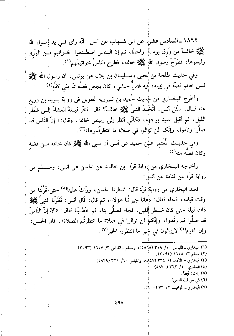1862 - السَّادِس عشر: عَن ابْن شهَاب عَن أنس: أَنه رأى فِي يَد رَسُول الله صلى الله عَلَيْهِ وَسلم خَاتمًا من ورق يَوْمًا وَاحِدًا، ثمَّ إِن النَّاس اصطنعوا الخواتيم من الْوَرق ولبسوها، فَطرح رَسُول الله صلى الله عَلَيْهِ وَسلم خَاتمه، فَطرح النَّاس خواتيمهم.