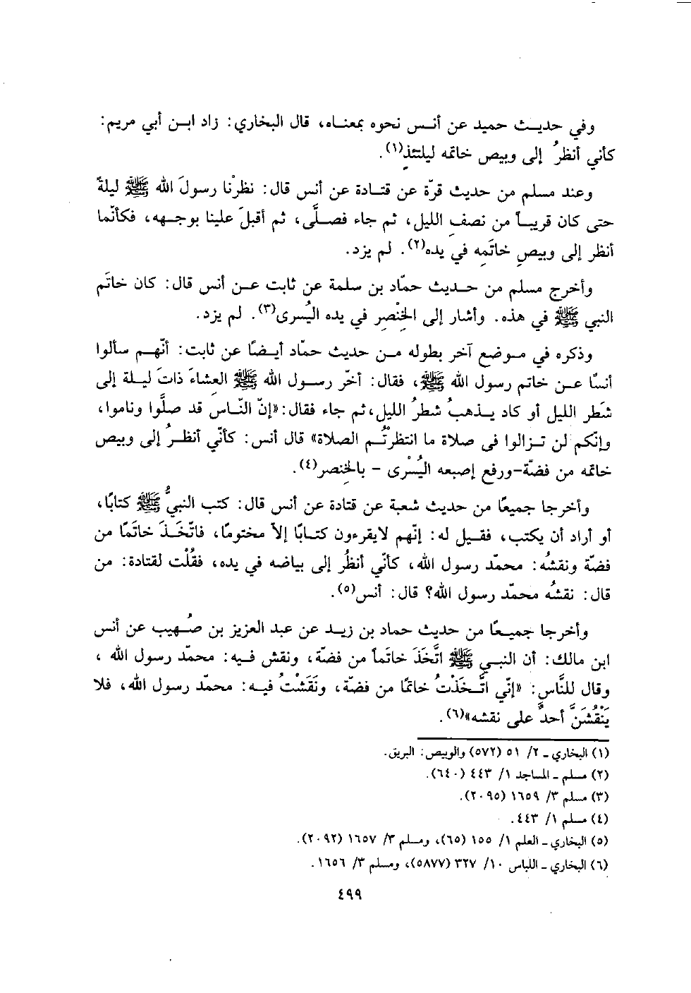 أَنهم سَأَلُوا أنسا عَن خَاتم رَسُول الله صلى الله عَلَيْهِ وَسلم، فَقَالَ: أخر رَسُول الله صلى الله عَلَيْهِ وَسلم الْعشَاء ذَات لَيْلَة إِلَى شطر اللَّيْل أَو كَاد يذهب شطر اللَّيْل، ثمَّ جَاءَ فَقَالَ: " إِن النَّاس قد صلوا وناموا، وَإِنَّكُمْ لن تزالوا فِي صَلَاة مَا انتظرتم الصَّلَاة " قَالَ أنس: كَأَنِّي أنظر إِلَى وبيص خَاتمه من فضَّة - وَرفع إصبعه الْيُسْرَى - بالخنصر.