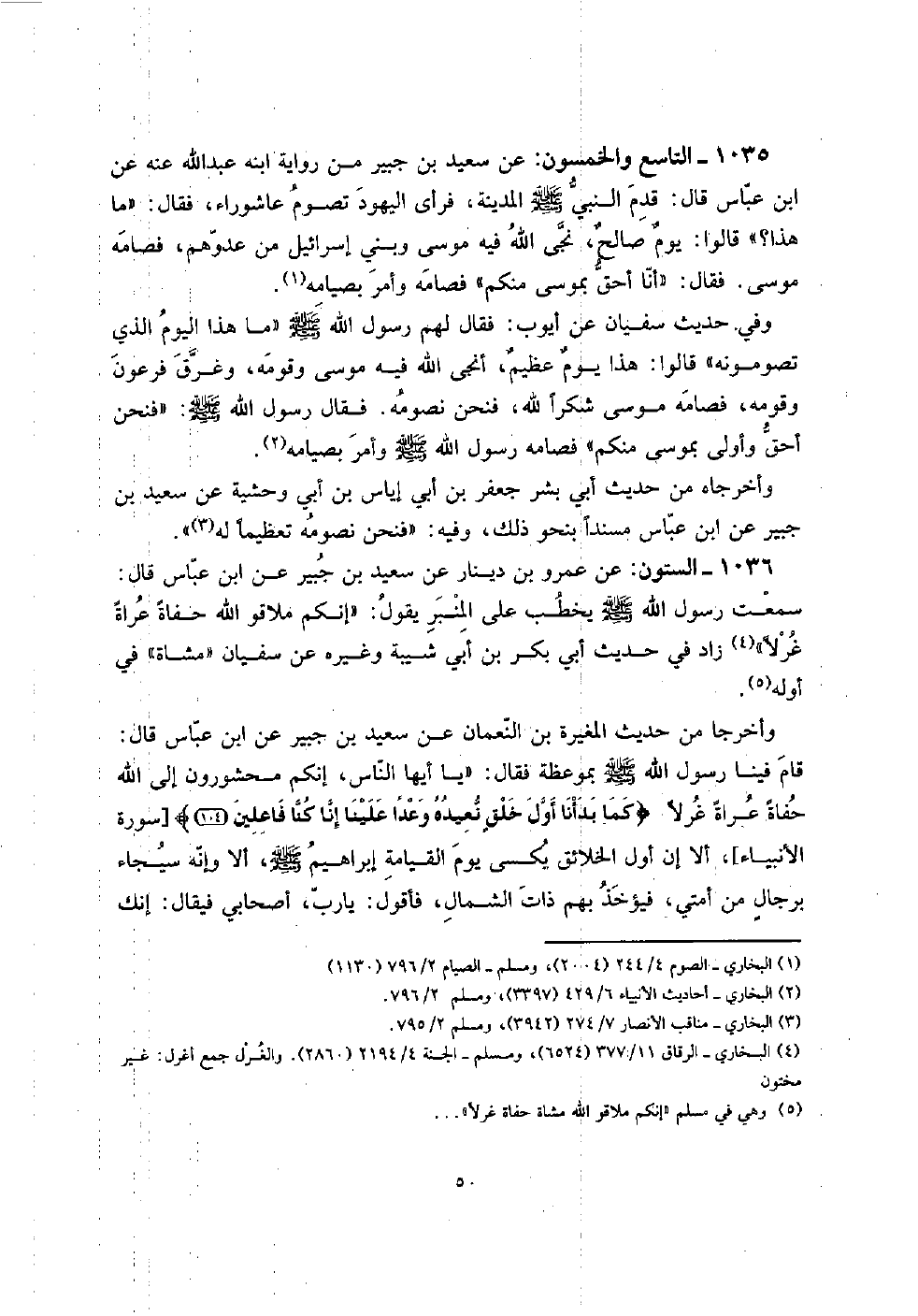 1035 - التَّاسِع وَالْخَمْسُونَ: عَن سعيد بن جُبَير من رِوَايَة ابْنه عبد الله عَنهُ عَن ابْن عَبَّاس قَالَ: قدم النَّبِي صلى الله عَلَيْهِ وَسلم الْمَدِينَة، فَرَأى الْيَهُود تَصُوم عَاشُورَاء، فَقَالَ: " مَا هَذَا؟ " قَالُوا: يومٌ صالحٌ، نجى الله فِيهِ مُوسَى وَبني إِسْرَائِيل من عدوهم، فصامه مُوسَى. فَقَالَ: " أَنا أَحَق بمُوسَى مِنْكُم " فصامه وَأمر بصيامه.