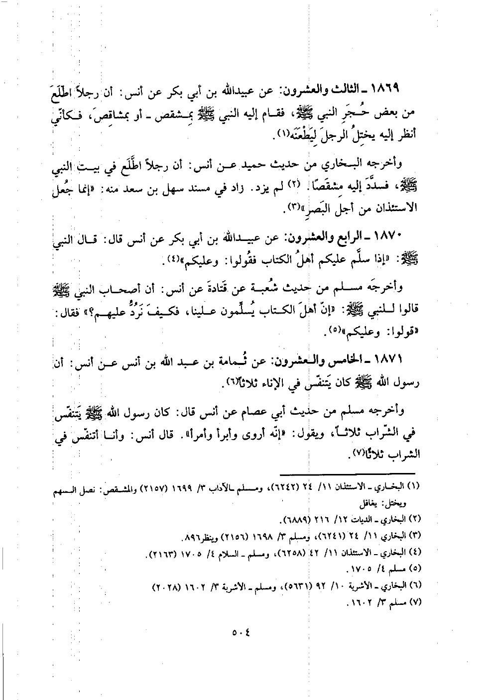 1869 - الثَّالِث وَالْعشْرُونَ: عَن عبيد الله بن أبي بكر عَن أنس: أَن رجلا اطلع من بعض حجر النَّبِي صلى الله عَلَيْهِ وَسلم، فَقَامَ إِلَيْهِ النَّبِي صلى الله عَلَيْهِ وَسلم بمشقص - أَو بمشاقص، فَكَأَنِّي أنظر إِلَيْهِ يخْتل الرجل ليطعنه.