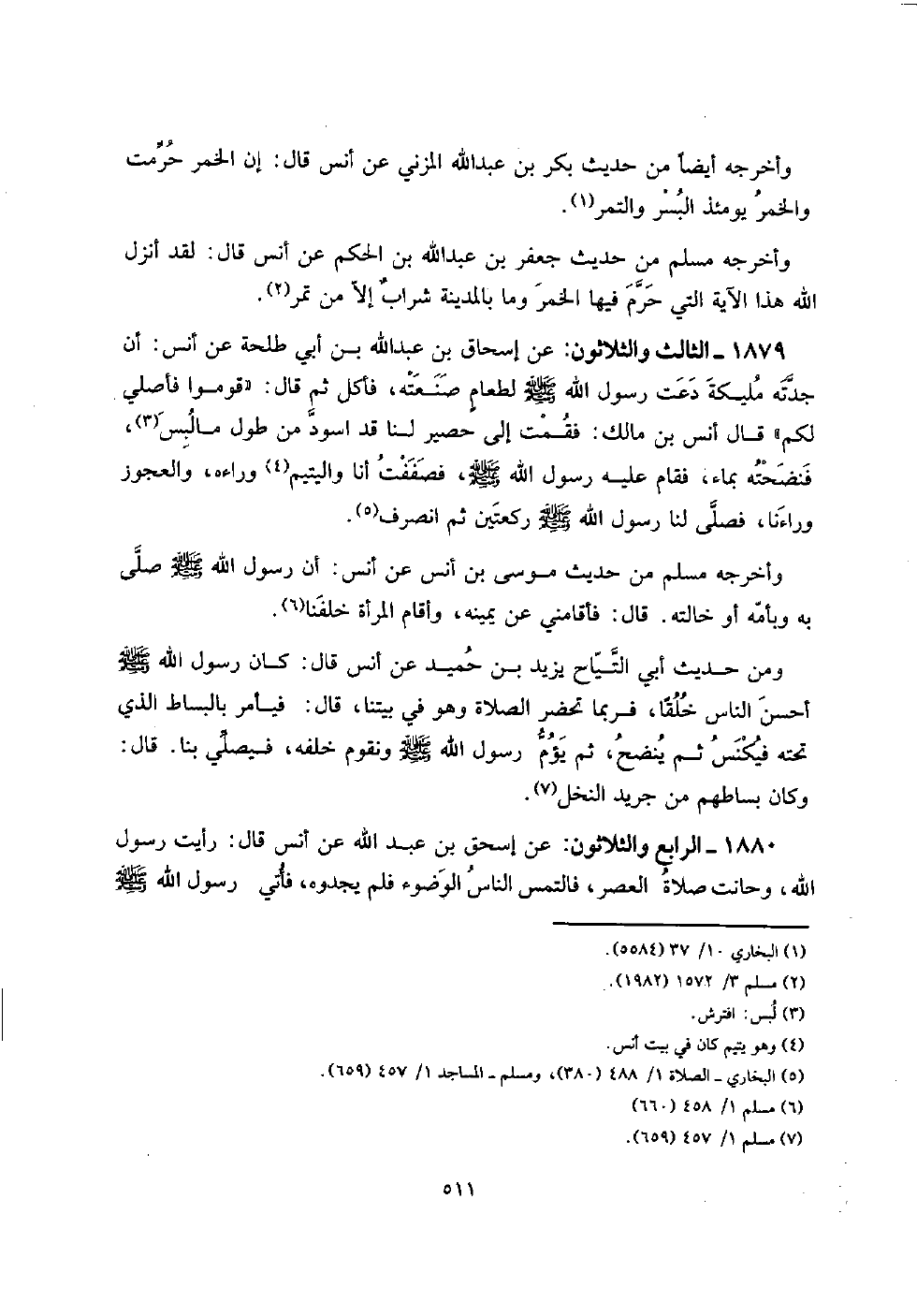 1879 - الثَّالِث وَالثَّلَاثُونَ: عَن إِسْحَاق بن عبد الله بن أبي طَلْحَة عَن أنس: أَن جدته مليكَة دعت رَسُول الله صلى الله عَلَيْهِ وَسلم لطعامٍ صَنعته، فَأكل ثمَّ قَالَ: " قومُوا فأصلي لكم " قَالَ أنس بن مَالك: فَقُمْت إِلَى حَصِير لنا قد اسود من طول مَا لبس، فنضحته بِمَاء، فَقَامَ عَلَيْهِ رَسُول الله صلى الله عَلَيْهِ وَسلم، فصففت أَنا واليتيم وَرَاءه، والعجوز وَرَاءَنَا، فصلى لنا رَسُول الله صلى الله عَلَيْهِ وَسلم رَكْعَتَيْنِ ثمَّ انْصَرف.