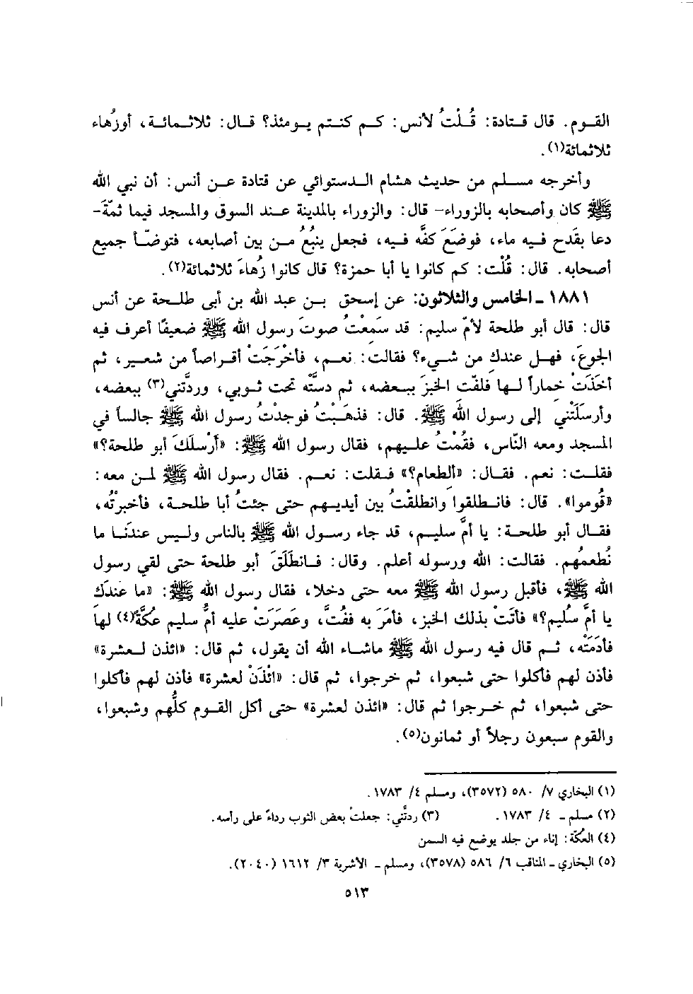 1881 - الْخَامِس وَالثَّلَاثُونَ: عَن إِسْحَق بن عبد الله بن أبي طَلْحَة عَن أنس قَالَ: قَالَ أَبُو طَلْحَة لأم سليم: قد سَمِعت صَوت رَسُول الله صلى الله عَلَيْهِ وَسلم ضَعِيفا أعرف فِيهِ الْجُوع، فَهَل عنْدك من شَيْء؟ فَقَالَت: نعم، فأخرجت أقراصاً من شعير، ثمَّ أخذت خماراً لَهَا فلفت الْخبز بِبَعْضِه، ثمَّ دسته تَحت ثوبي، وردتني بِبَعْضِه، وأرسلتني إِلَى رَسُول الله صلى الله عَلَيْهِ وَسلم. قَالَ: فَذَهَبت فَوجدت رَسُول الله صلى الله عَلَيْهِ وَسلم جَالِسا فِي الْمَسْجِد وَمَعَهُ النَّاس، فَقُمْت عَلَيْهِم، فَقَالَ رَسُول الله صلى الله عَلَيْهِ وَسلم: " أرسلك أَبُو طَلْحَة؟ " فَقلت: نعم. فَقَالَ: " ألطعام؟ " فَقلت: نعم. فَقَالَ رَسُول الله صلى الله عَلَيْهِ وَسلم لمن مَعَه: " قومُوا ". قَالَ: فَانْطَلقُوا وَانْطَلَقت بَين أَيْديهم حَتَّى جِئْت أَبَا طَلْحَة، فَأَخْبَرته، فَقَالَ أَبُو طَلْحَة: يَا أم سليم، قد جَاءَ رَسُول الله صلى الله عَلَيْهِ وَسلم بِالنَّاسِ وَلَيْسَ عندنَا مَا نطعمهم. فَقَالَت: الله وَرَسُوله أعلم. وَقَالَ: فَانْطَلق أَبُو طَلْحَة حَتَّى لَقِي رَسُول الله صلى الله عَلَيْهِ وَسلم، فَأقبل رَسُول الله صلى الله عَلَيْهِ وَسلم مَعَه حَتَّى دخلا، فَقَالَ رَسُول الله صلى الله عَلَيْهِ وَسلم: " مَا عنْدك يَا أم سليم؟ " فَأَتَت بذلك الْخبز، فَأمر بِهِ ففت، وعصرت عَلَيْهِ أم سليم عكةً لَهَا فأدمته، ثمَّ قَالَ فِيهِ رَسُول الله صلى الله عَلَيْهِ وَسلم مَا شَاءَ الله أَن يَقُول، ثمَّ قَالَ: " ائْذَنْ لعشرة " فَأذن لَهُم فَأَكَلُوا حَتَّى شَبِعُوا، ثمَّ خَرجُوا، ثمَّ قَالَ: " ائْذَنْ لعشرة " فَأذن لَهُم فَأَكَلُوا حَتَّى شَبِعُوا، ثمَّ خَرجُوا ثمَّ قَالَ: " ائْذَنْ لعشرة " حَتَّى أكل الْقَوْم كلهم وشبعوا، وَالْقَوْم سَبْعُونَ رجلا أَو ثَمَانُون ".