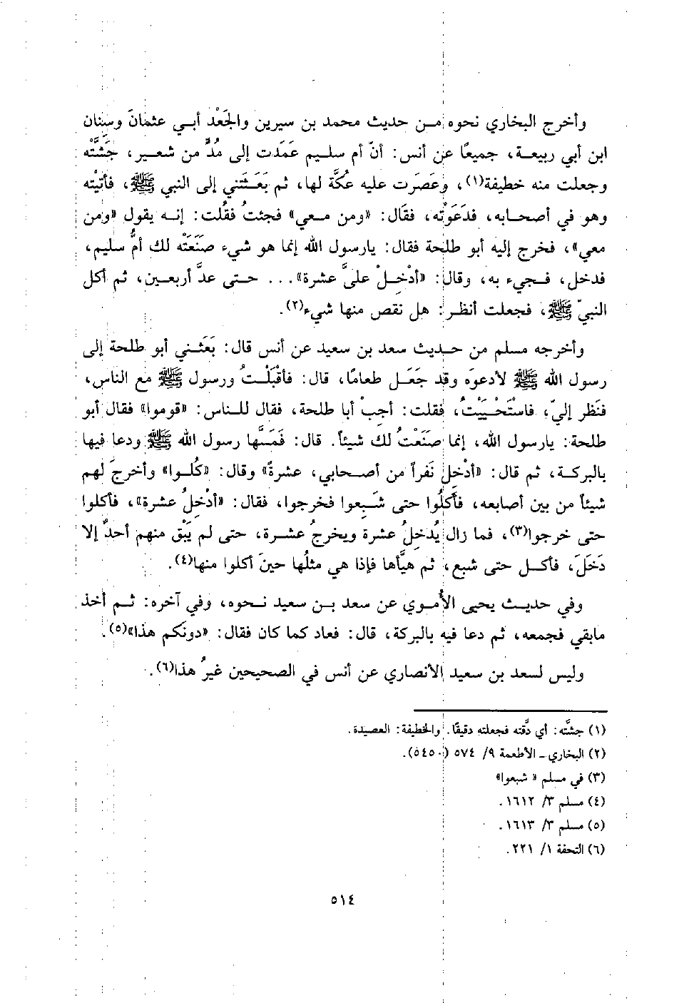 أَن أم سليم عَمَدت إِلَى مدٍّ من شعير، جشته وَجعلت مِنْهُ خطيفة، وعصرت عَلَيْهِ عكة لَهَا، ثمَّ بعثتني إِلَى النَّبِي صلى الله عَلَيْهِ وَسلم، فَأَتَيْته وَهُوَ فِي أَصْحَابه، فدعوته، فَقَالَ: " وَمن معي " فَجئْت فَقلت: إِنَّه يَقُول " وَمن معي "، فَخرج إِلَيْهِ أَبُو طَلْحَة فَقَالَ: يَا رَسُول الله إِنَّمَا هُوَ شَيْء صَنعته لَك أم سليم، فَدخل، فجيء بِهِ، وَقَالَ: " أَدخل عَليّ عشرَة " ... حَتَّى عد أَرْبَعِينَ، ثمَّ أكل النَّبِي صلى الله عَلَيْهِ وَسلم، فَجعلت أنظر: هَل نقص مِنْهَا شَيْء.