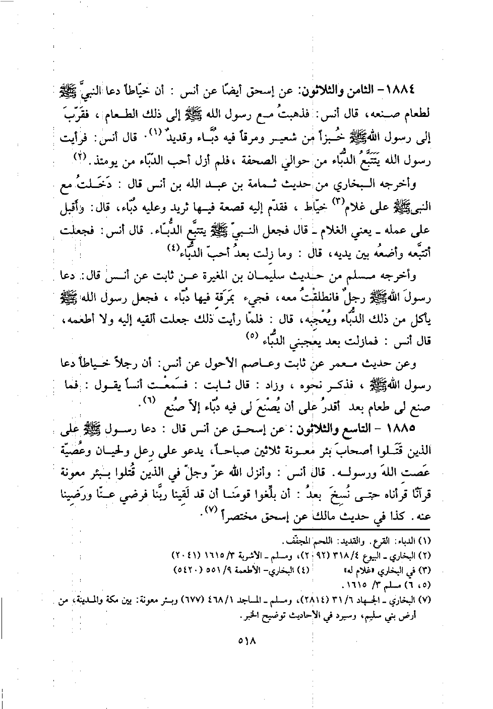 1884 - الثَّامِن وَالثَّلَاثُونَ: عَن إِسْحَق أَيْضا عَن أنس: أَن خياطاً دَعَا النَّبِي صلى الله عَلَيْهِ وَسلم لطعام صنعه، قَالَ أنس: فَذَهَبت مَعَ رَسُول الله صلى الله عَلَيْهِ وَسلم إِلَى ذَلِك الطَّعَام، فَقرب إِلَى رَسُول الله صلى الله عَلَيْهِ وَسلم خبْزًا من شعير ومرقاً فِيهِ دباء وقديدٌ. قَالَ أنس: فَرَأَيْت رَسُول الله يتتبع الدُّبَّاء من حوالي الصحفة، فَلم أزل أحب الدُّبَّاء من يَوْمئِذٍ.
