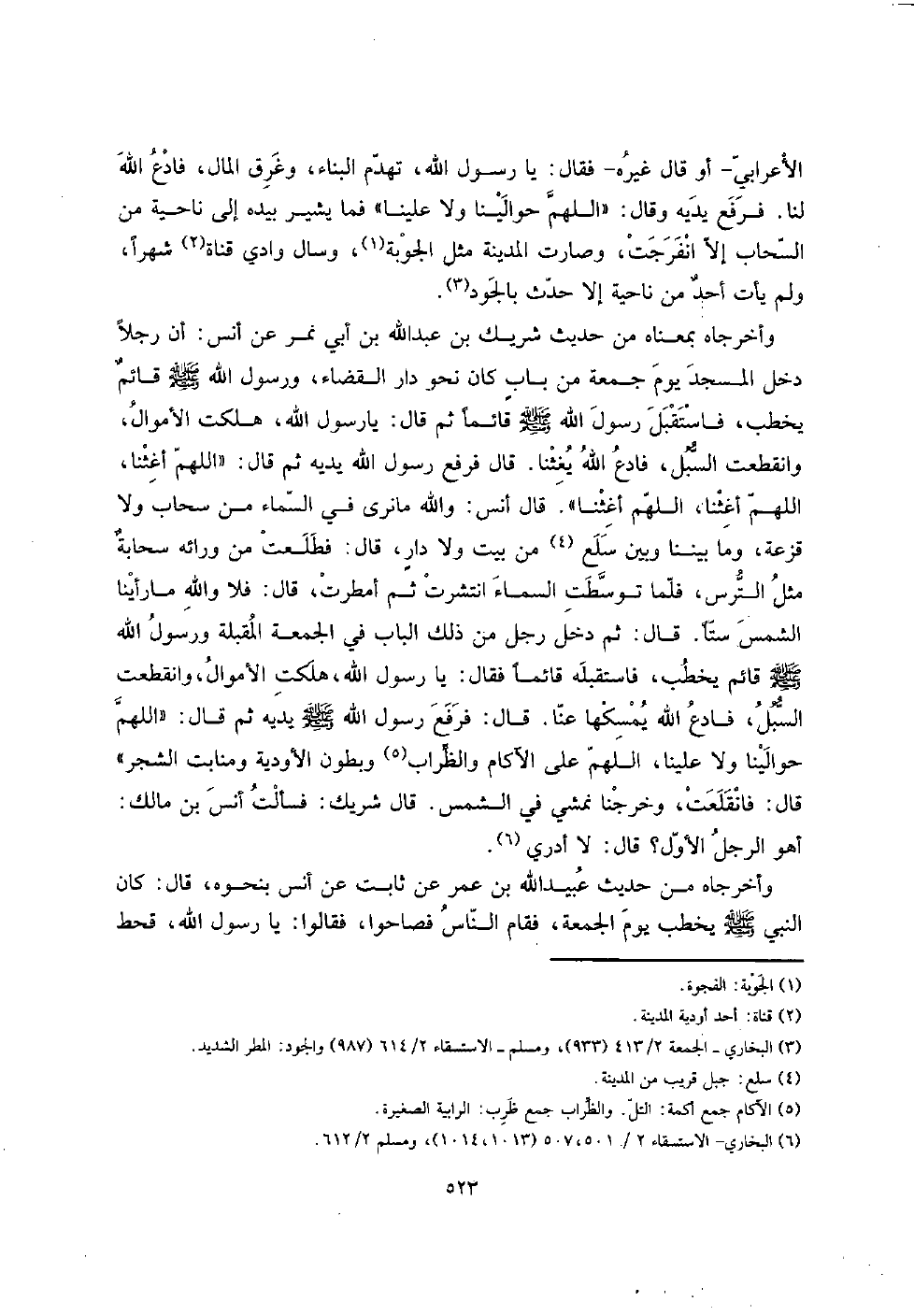 أَن رجلا دخل الْمَسْجِد يَوْم جُمُعَة من بابٍ كَانَ نَحْو دَار الْقَضَاء، وَرَسُول الله صلى الله عَلَيْهِ وَسلم قائمٌ يخْطب، فَاسْتقْبل رَسُول الله صلى الله عَلَيْهِ وَسلم قَائِما ثمَّ قَالَ: يَا رَسُول الله، هَلَكت الْأَمْوَال، وانقطعت السبل، فَادع الله يغثنا. قَالَ فَرفع رَسُول الله يَدَيْهِ ثمَّ قَالَ: " اللَّهُمَّ أغثنا، اللَّهُمَّ أغثنا، اللَّهُمَّ أغثنا ". قَالَ أنس: وَالله مَا نرى فِي السَّمَاء من سَحَاب وَلَا قزعة، وَمَا بَيْننَا وَبَين سلع من بَيت وَلَا دارٍ، قَالَ: فطلعت من وَرَائه سحابةٌ مثل الترس، فَلَمَّا توسطت السَّمَاء انتشرت ثمَّ أمْطرت، قَالَ: فَلَا وَالله مَا رَأينَا الشَّمْس سِتا. قَالَ: ثمَّ دخل رجل من ذَلِك الْبَاب فِي الْجُمُعَة الْمُقبلَة وَرَسُول الله صلى الله عَلَيْهِ وَسلم قَائِم يخْطب، فَاسْتَقْبلهُ قَائِما فَقَالَ: يَا رَسُول الله، هَلَكت الْأَمْوَال، وانقطعت السبل، فَادع الله يمْسِكهَا عَنَّا. قَالَ: فَرفع رَسُول الله صلى الله عَلَيْهِ وَسلم يَدَيْهِ ثمَّ قَالَ: " اللَّهُمَّ حوالينا وَلَا علينا، اللَّهُمَّ على الآكام والظراب وبطون الأودية ومنابت الشَّجَرَة " قَالَ: فانقلعت، وَخَرجْنَا نمشي فِي الشَّمْس. قَالَ شريك: فَسَأَلت أنس بن مَالك: أهوَ الرجل الأول؟ قَالَ: لَا أَدْرِي.