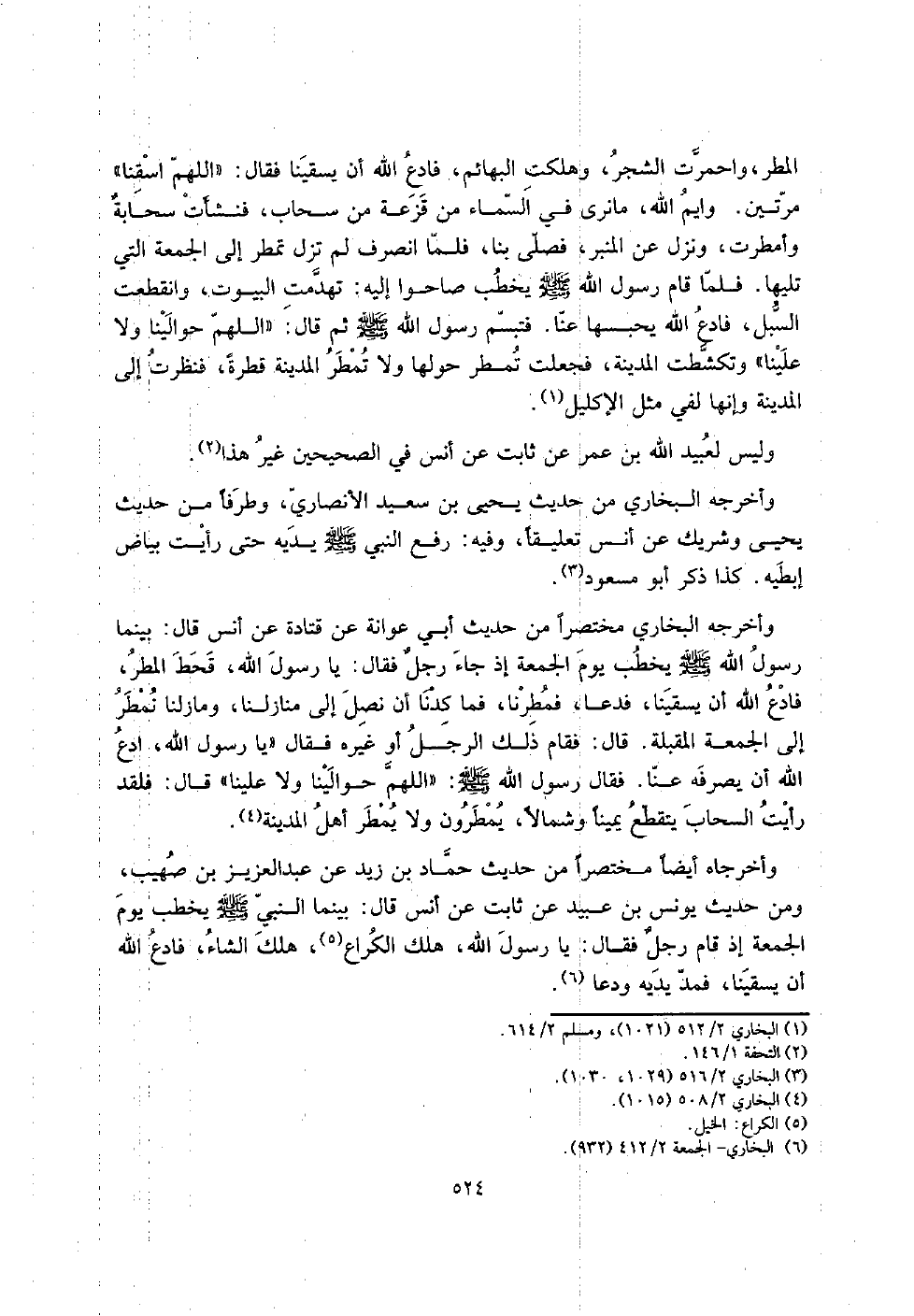 بَيْنَمَا رَسُول الله صلى الله عَلَيْهِ وَسلم يخْطب يَوْم الْجُمُعَة إِذْ جَاءَ رجلٌ فَقَالَ: يَا رَسُول الله، قحط الْمَطَر، فَادع الله أَن يسقينا، فَدَعَا، فمطرنا، فَمَا كدنا أَن نصل إِلَى مَنَازلنَا، وَمَا زلنا نمطر إِلَى الْجُمُعَة الْمُقبلَة. قَالَ: فَقَامَ ذَلِك الرجل أَو غَيره فَقَالَ " يَا رَسُول الله، ادْع الله أَن يصرفهُ عَنَّا. فَقَالَ رَسُول الله صلى الله عَلَيْهِ وَسلم: " اللَّهُمَّ حوالينا وَلَا علينا " قَالَ: فَلَقَد رَأَيْت السَّحَاب يتقطع يَمِينا وَشمَالًا، يمطرون وَلَا يمطر أهل الْمَدِينَة.