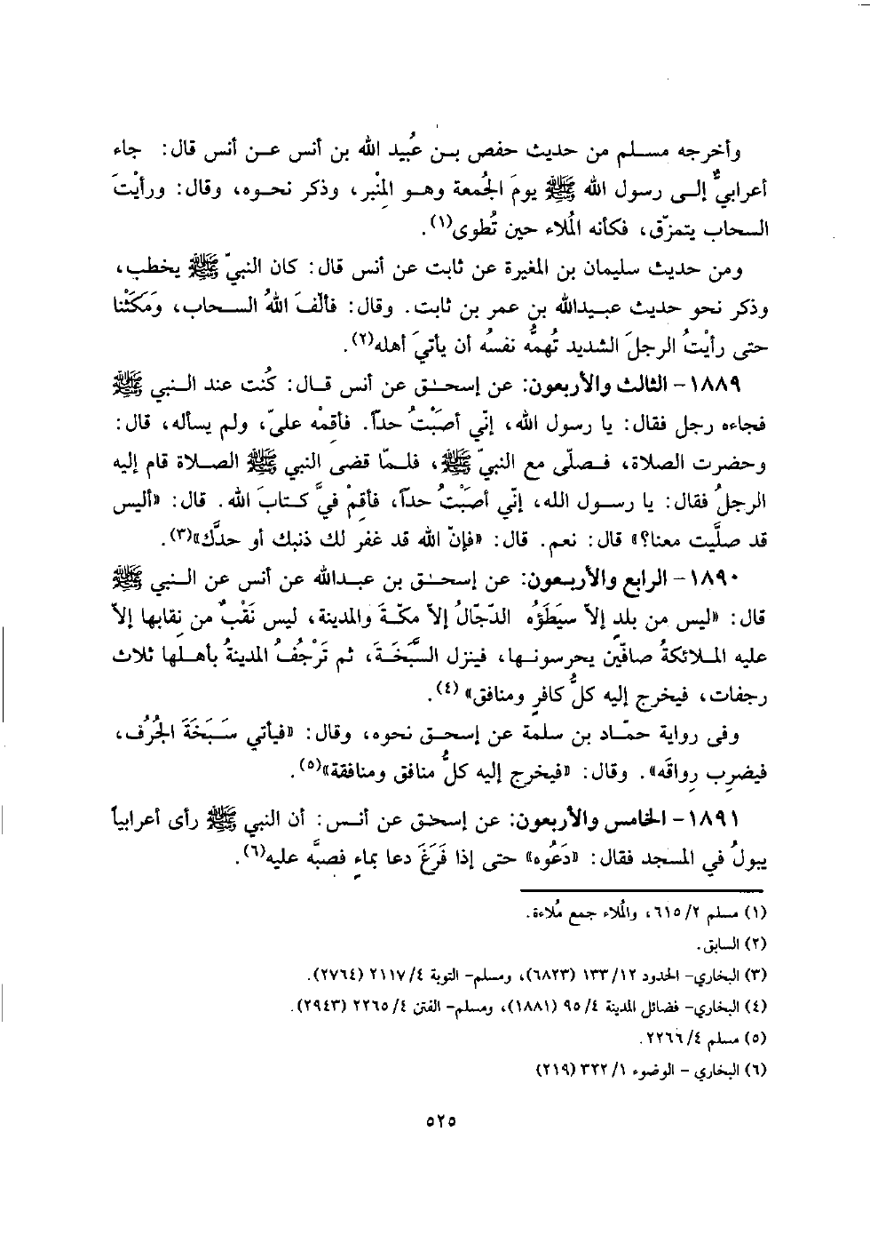 1890 - الرَّابِع وَالْأَرْبَعُونَ: عَن إِسْحَق بن عبد الله عَن أنس عَن النَّبِي صلى الله عَلَيْهِ وَسلم قَالَ: " لَيْسَ من بلدٍ إِلَّا سيطؤه الدَّجَّال إِلَّا مَكَّة وَالْمَدينَة، لَيْسَ نقبٌ من نقابها إِلَّا عَلَيْهِ الْمَلَائِكَة صافين يحرسونها، فَينزل السبخة، ثمَّ ترجف الْمَدِينَة بِأَهْلِهَا ثَلَاث رجفات، فَيخرج إِلَيْهِ كل كافرٍ ومنافق ".